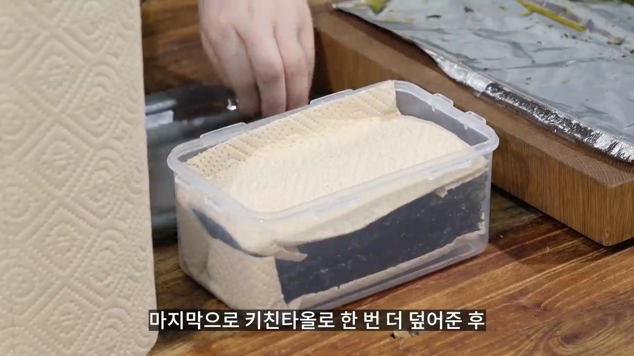 그 위에 키친타올을 깔아준 후 뚜껑을 닫아 냉장 보관해주시면 됩니다.