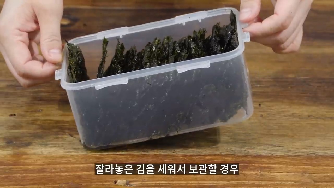 밀폐용기에 조미김을 담고 포장지 속 제습제를 함께 넣어주세요.