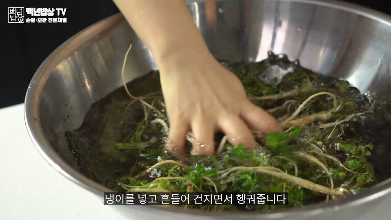 20분후 볼에 물을 담아 냉이를 넣고 흔들어 건지면서 헹궈 줍니다.