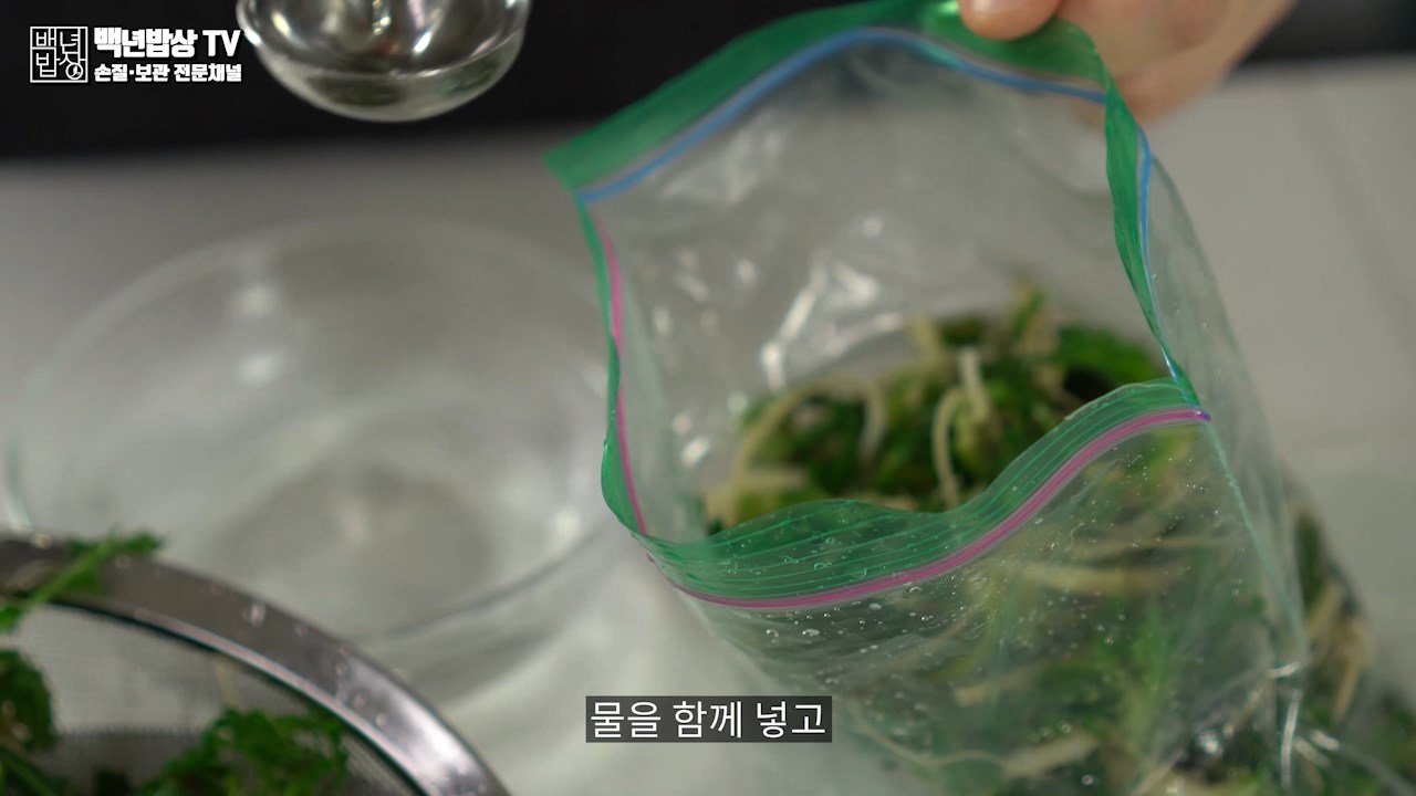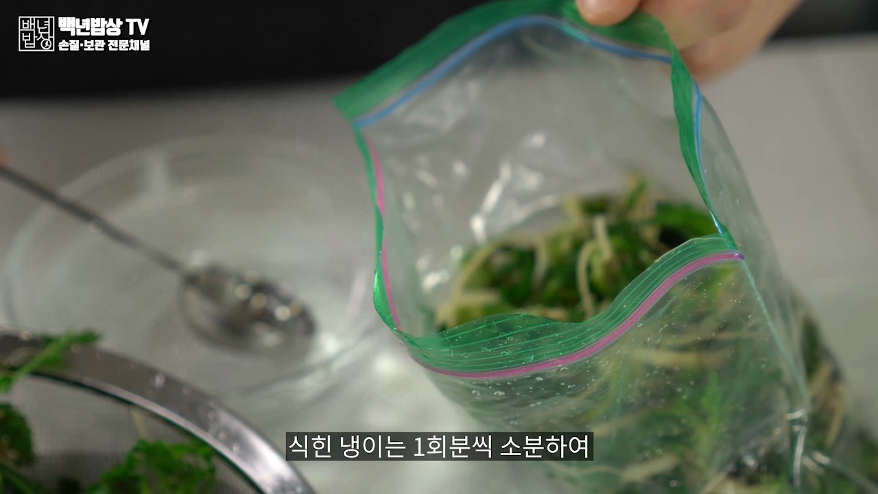식힌 냉이는 1회분씩 소분하여 물2T를 함께 넣어 비닐팩에 넣어 밀봉을 해주세요.