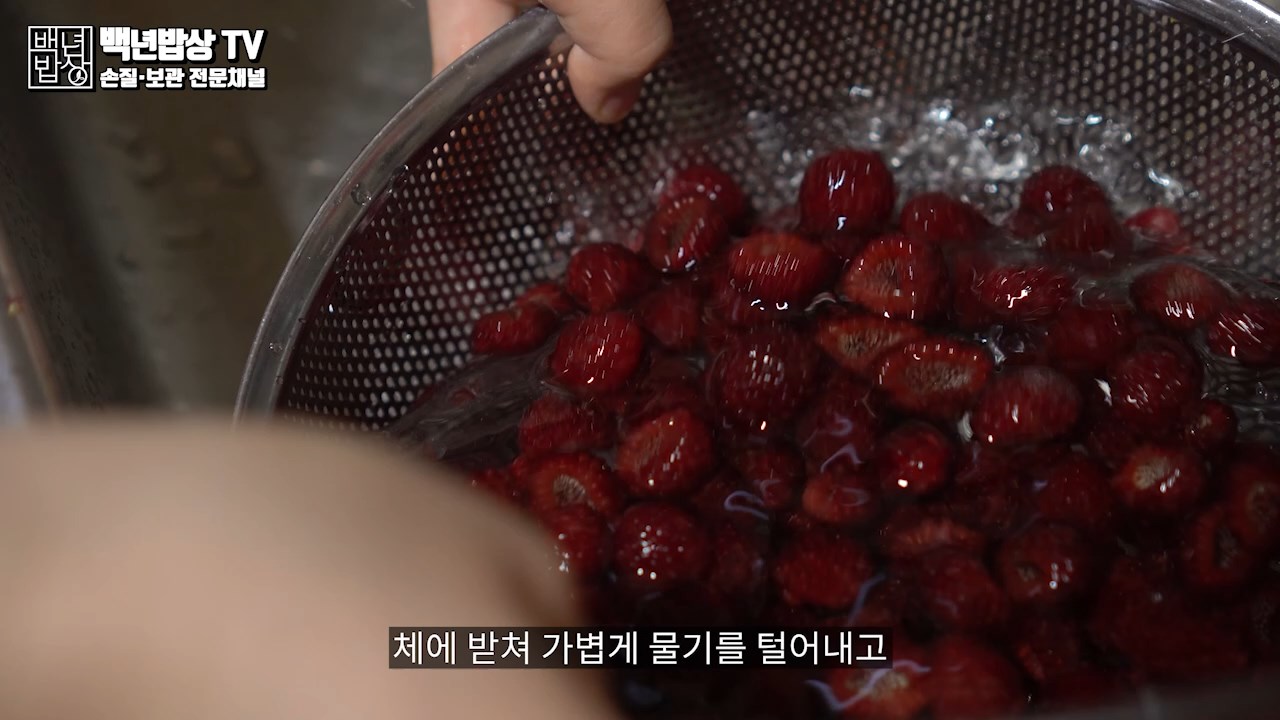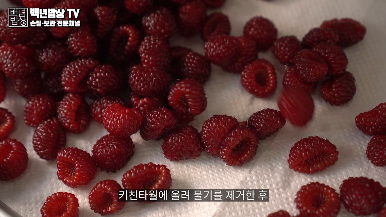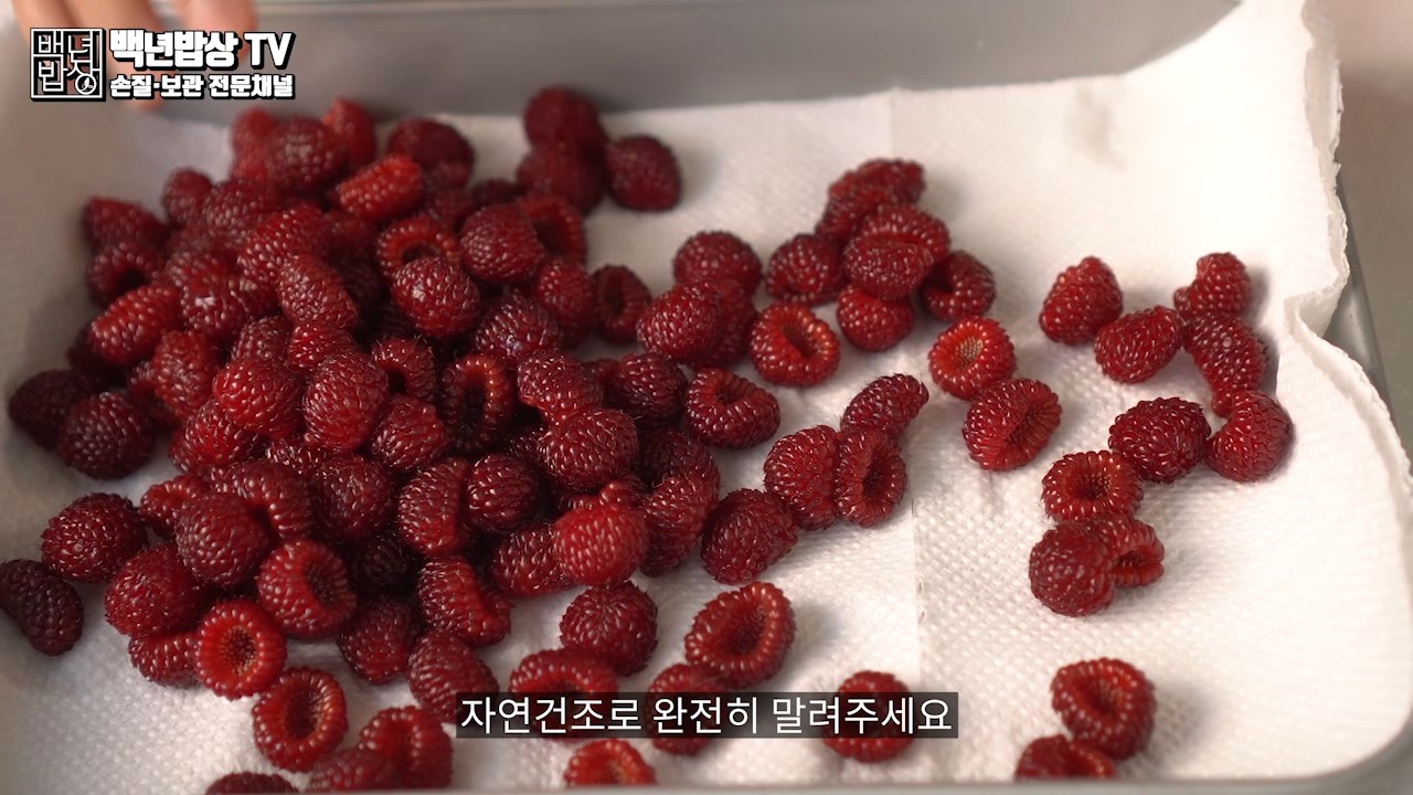 체에 받쳐 가볍게 물기를 털어내고 키친 타올에 올려 물기를 제거 한 후 자연건조로 완전히 말려 줍니다. (산딸기는 습기에 약해 실온에서 오래 두면 좋지 않으니 빠르게 말려 주는 것이 좋습니다.) 질좋은 산딸기라도 쉽게 상할수 있으니 짧은시간 세척법 꼭 지켜 주세요.