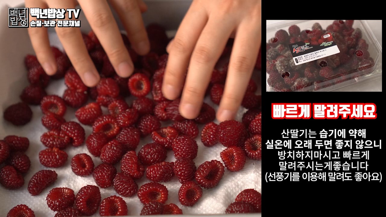 먼저 산딸기를 펼치고 무른것이 없는지 선별 해주세요. 혹 곰팡이가 피었다면 모두 폐기 처분 하기를 권장 합니다.