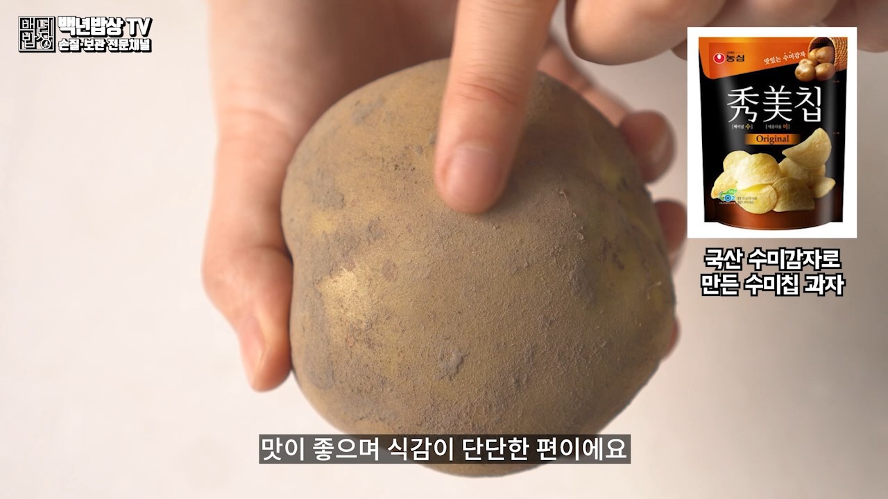 수미감자는 수분, 전분 함유량이 적당해 맛이 좋으며 식감이 단단한 편이에요. 포슬한 식감을 선호 하신다면 대서, 남작 품종의 감자를 구매하세요. (과자로 사용되는 감자는 분질 감자로 가공하기 쉬운 대서감자를 사용합니다. 허니버터칩, 포카칩 등..)