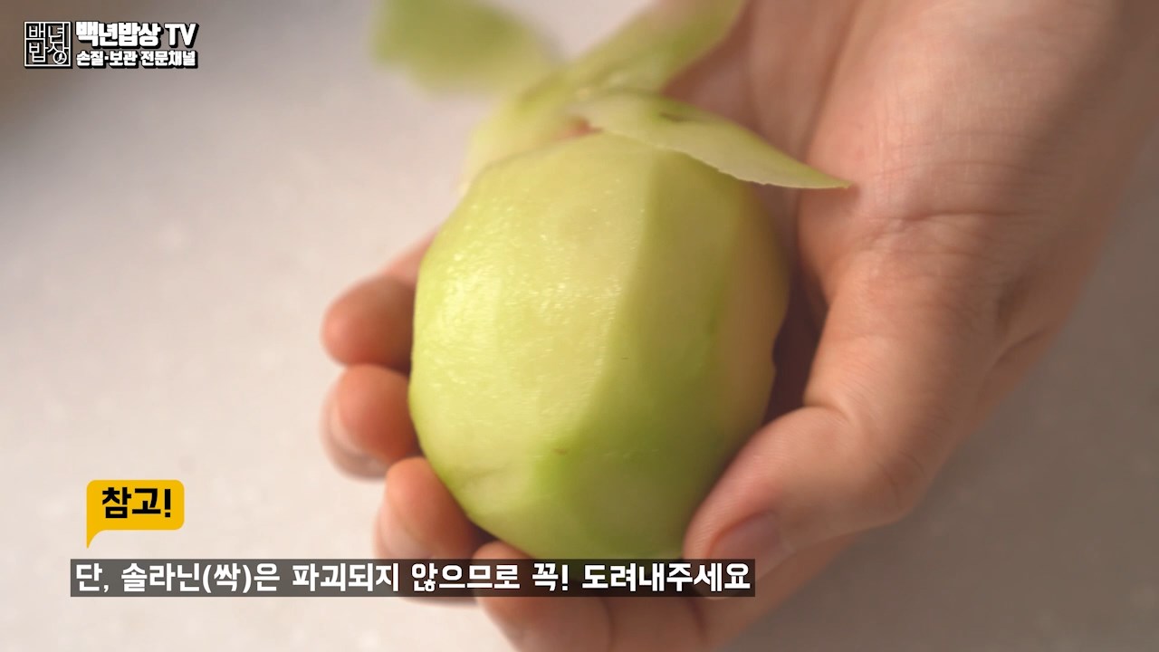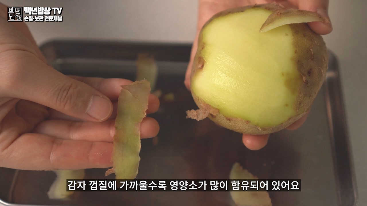 감자껍질을 최대한 얇게 벗겨 주세요. 감자껍질에 가까울수록 항산화 작용을 하는 클로로젠산등 영양소가 많이 함유되어 있어요. 감자를 조리할 때는 처음부터 물에 넣고 껍질채 조리하는 것이 영양소(비타민, 칼슘, 철분, 칼륨 등)를 잃지 않고 좋습니다.