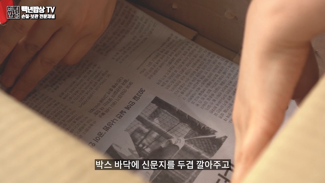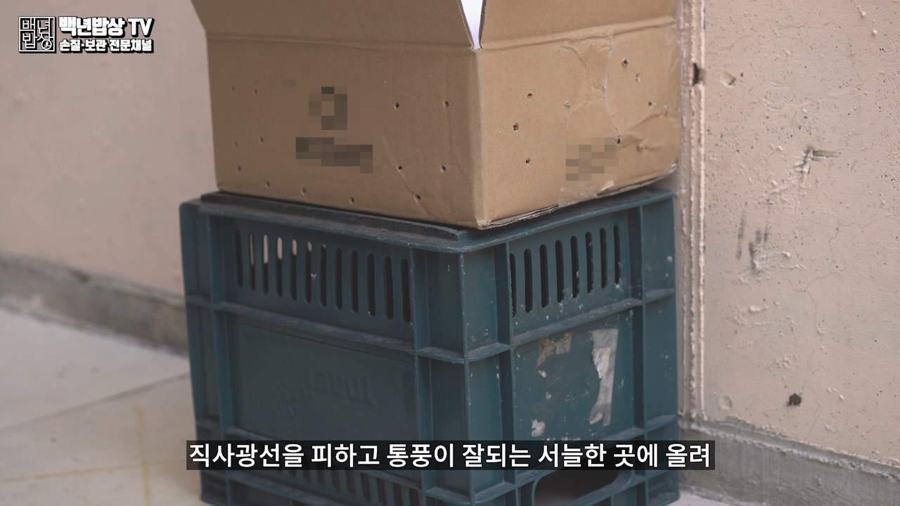 박스를 준비해 주시고 송곳을 이용하여 옆면에 숨구멍을 뚫어 줍니다. 박스 바닥에 신문지를 2겹 깔아 주고, 공간을 주면서 큐어링 한 감자를 넣어주세요.