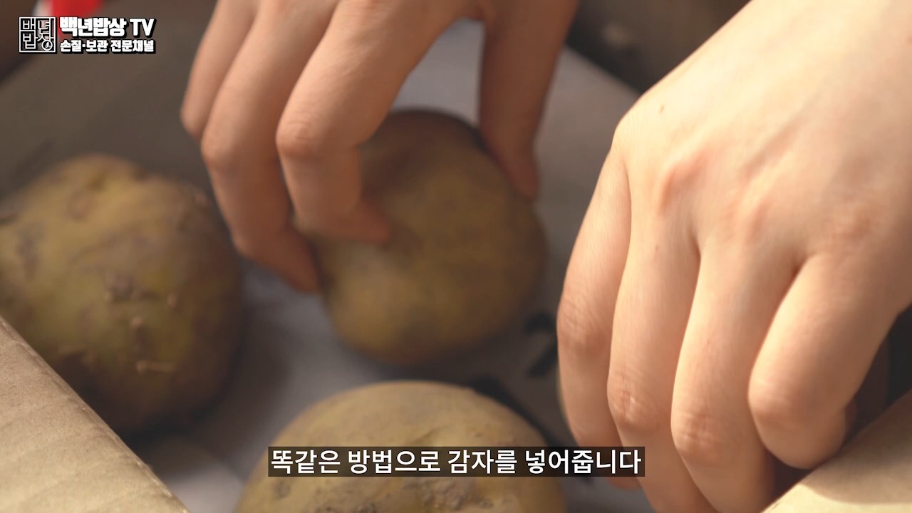 또한 보관할 때 양파와 같이 수분이 많은 식재료와 함께 보관하지 마세요. 감자가 수분을 먹어 물러지고 싹이 더 빨리 날 수 있습니다. 직사광선을 피하고 통풍이 잘되는 서늘한 곳(상온 2~4도)에 올려 보관하면 3개월 동안 거뜬히 보관 할 수 있습니다.