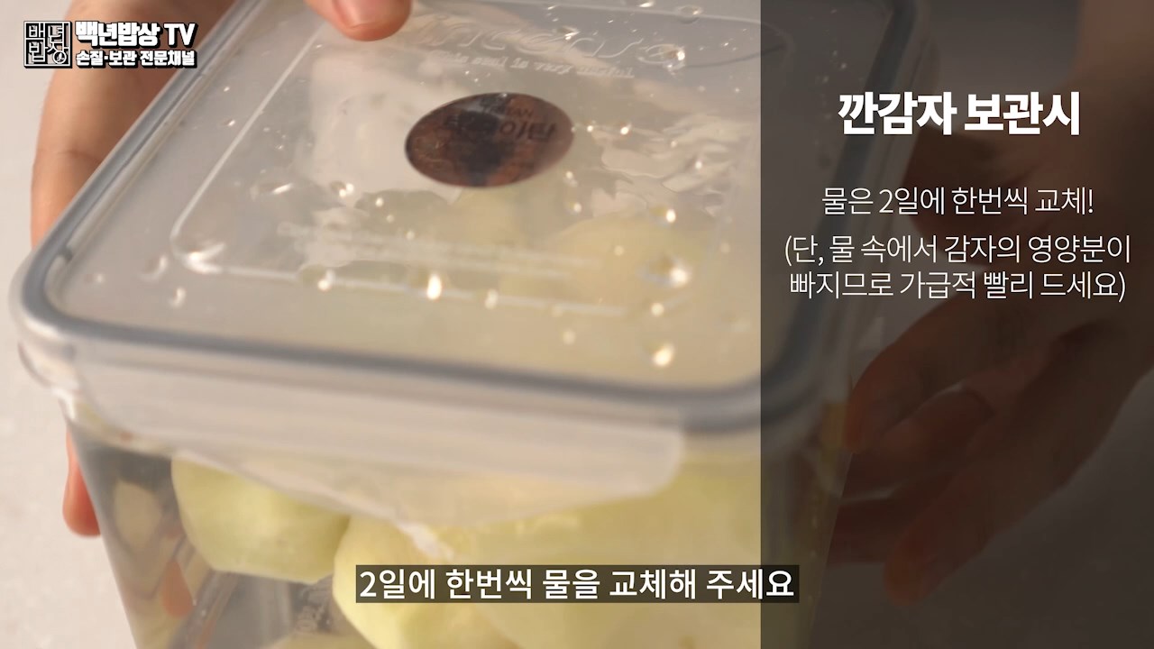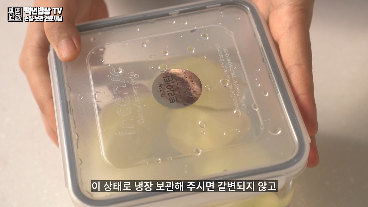 이 상태로 냉장 보관 해주시면 갈변되지 않고 1주일 동안 보관 가능해요. 2일에 한 번씩 물 교체해 주세요. 단, 물속에서 감자의 영양분이 빠지므로 가급적 빨리 드세요.
