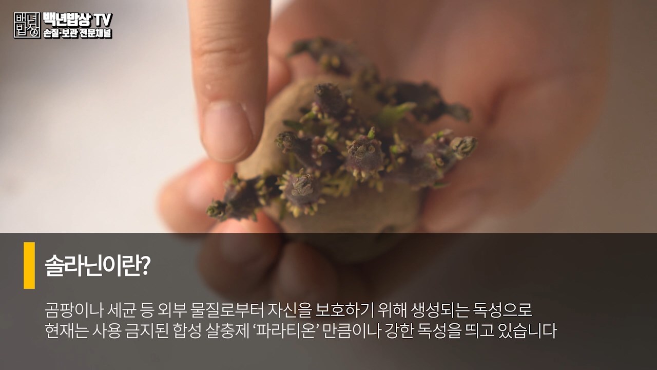 곰팡이나 세균 등 외부물질로부터 자기 자신을 보호하기 위해 생성되는 독성으로 그 독성은 현재 사용 금지된 합성살충제 ‘파라티온’만큼이나 강한 독성을 띠고 있습니다. 열을 가해도 파괴되지 않으며 솔라닌 30mg 이상 섭취시 복통, 구토 및 식중독 증상을 일으킬 수 있으니 꼭! 안전히 제거 후 드셔주셔야 합니다.