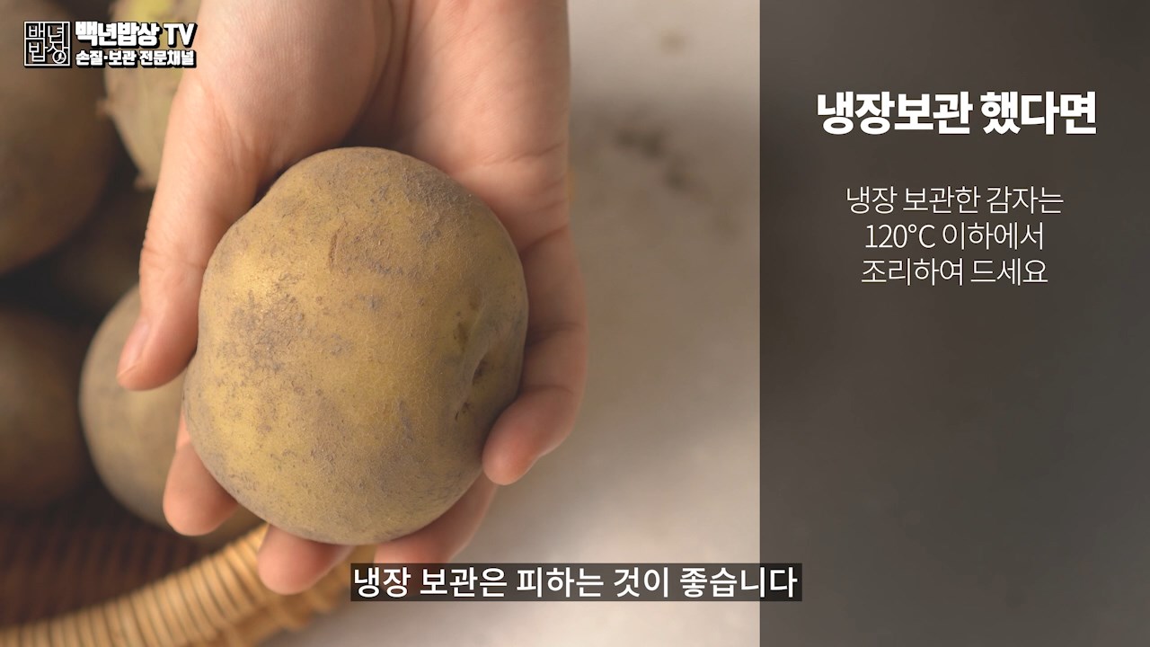 이렇게 단당화된 감자를 고온(160℃ 이상)에서 굽거나 튀길 때 당분이 아스파라긴과 합쳐져 발암물질인 아크릴아미드가 생성되므로 냉장 보관은 피하는 것이 좋습니다. 냉장 보관한 감자를 드실 때는 120℃ 이하에서 조리하여 드세요.