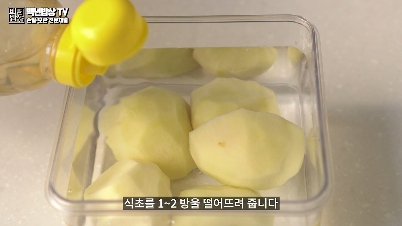 감자가 들어갈 만한 용기를 준비하고 남은 감자를 넣어 잠길 만큼 물을 채웁니다. 식초를 1~2방울 떨어트려 줍니다.