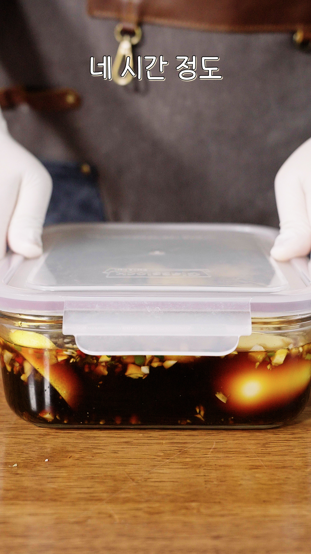 4. 계란 껍질을 벗긴 뒤 밀폐용기에 담고 간장과 야채를 넣어주세요.