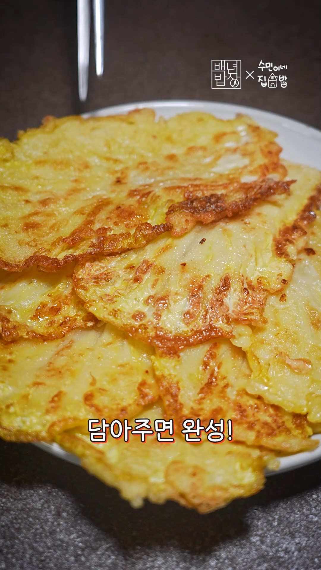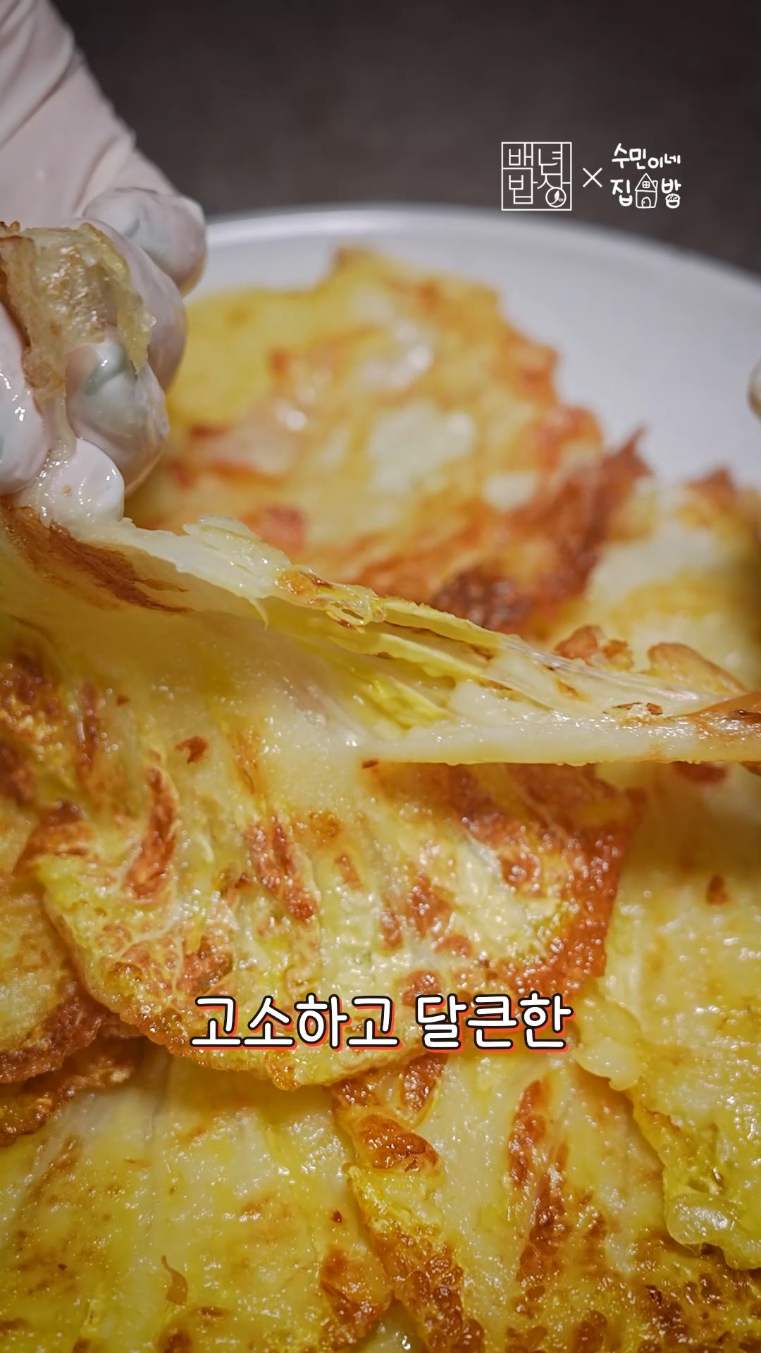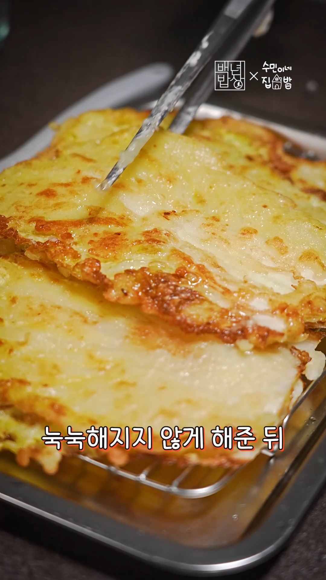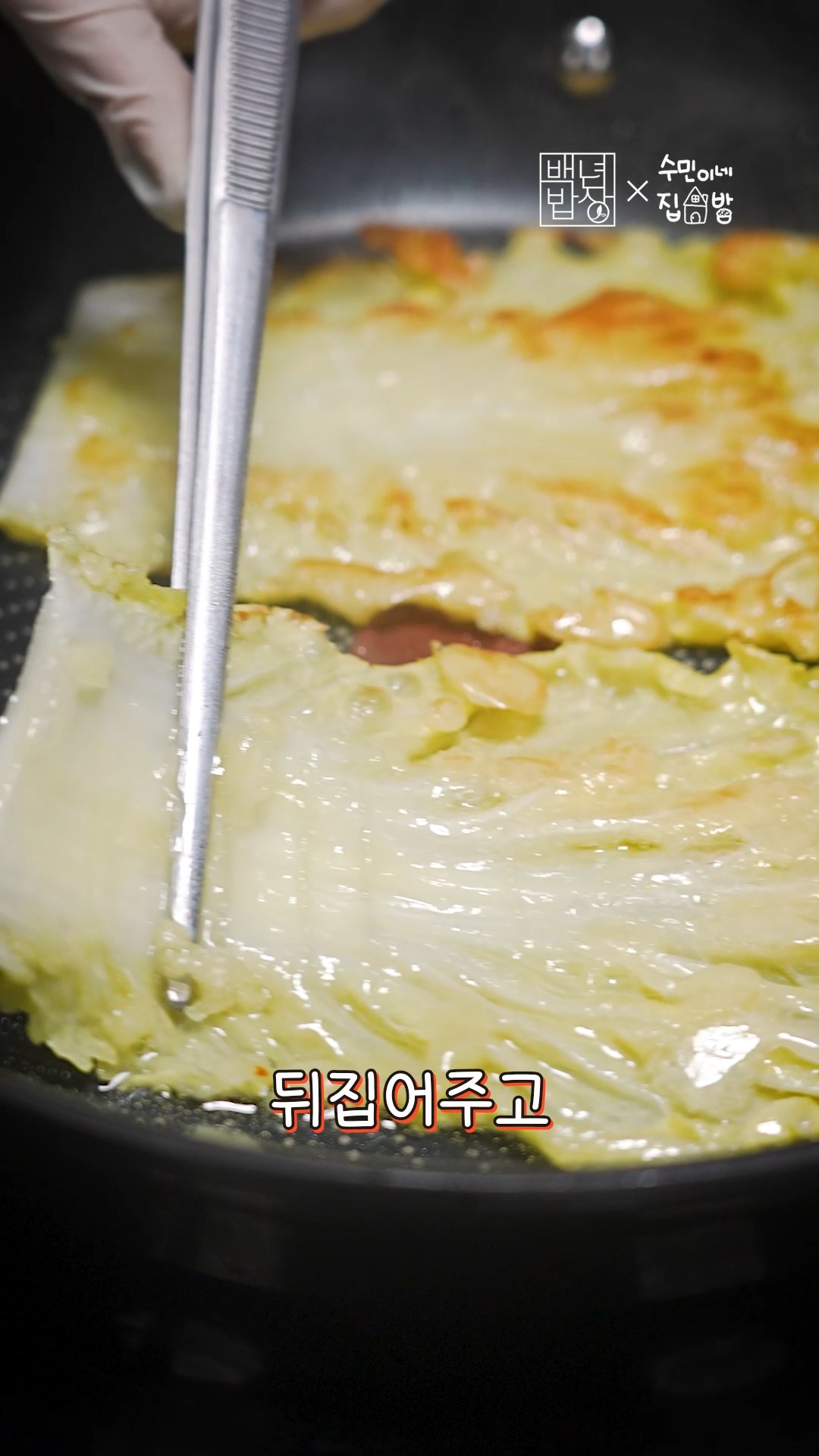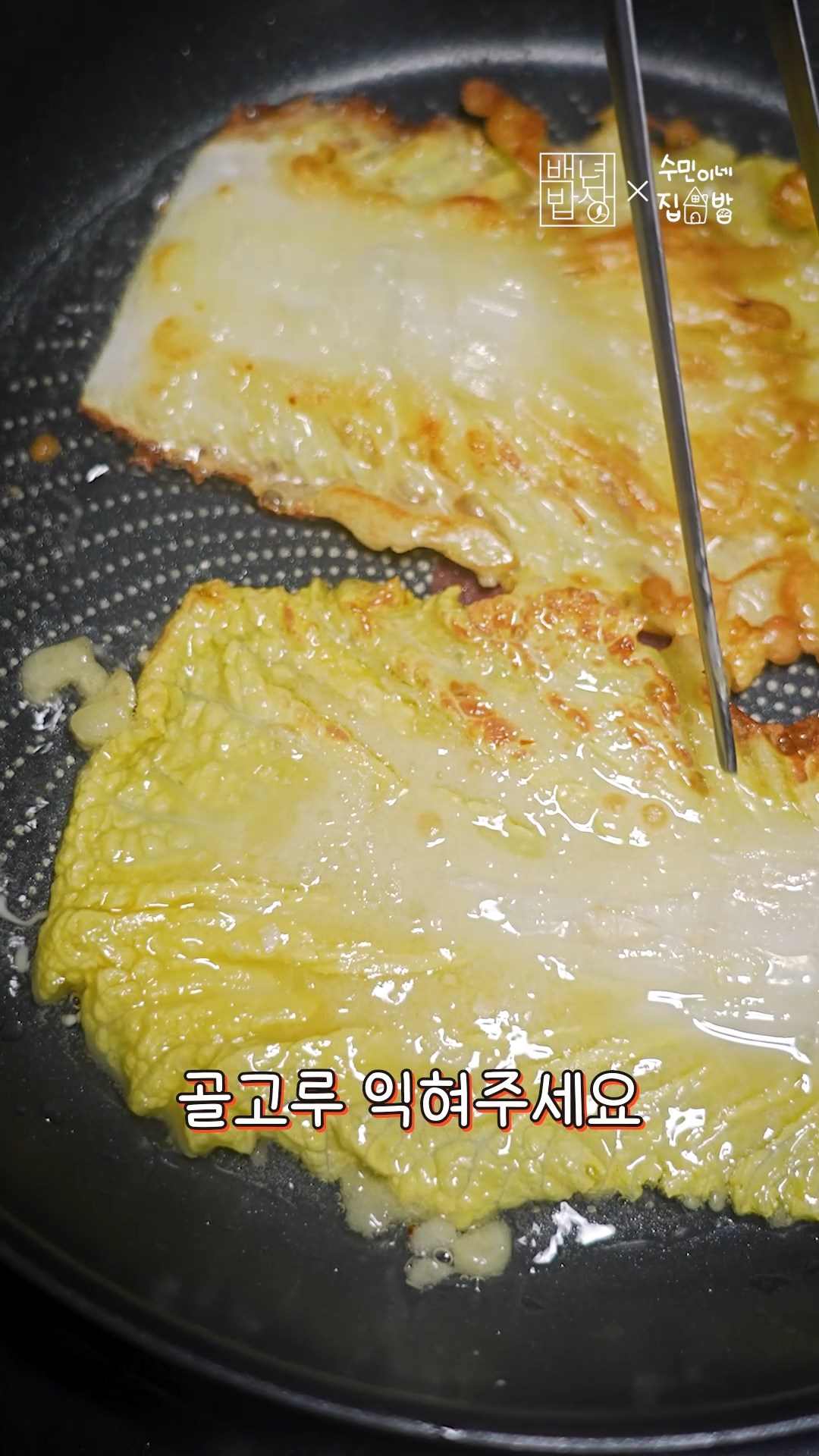 4. 팬에 기름을 두르고 달군 뒤 중약불로 낮춰 배추를 노릇하게 구워주세요.
