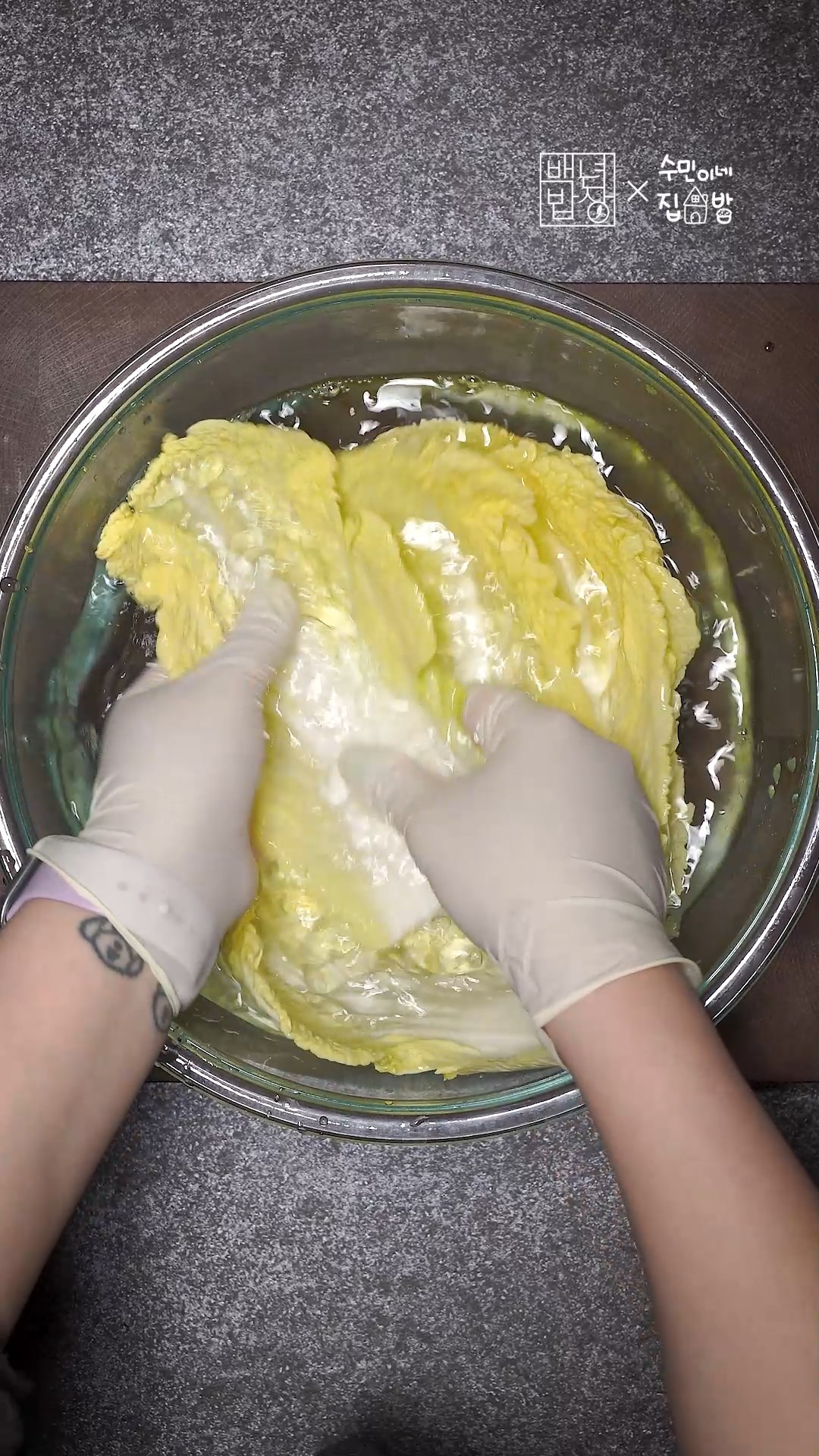 3. 배추를 반죽에 넣어 반죽물을 골고루 입혀주세요.