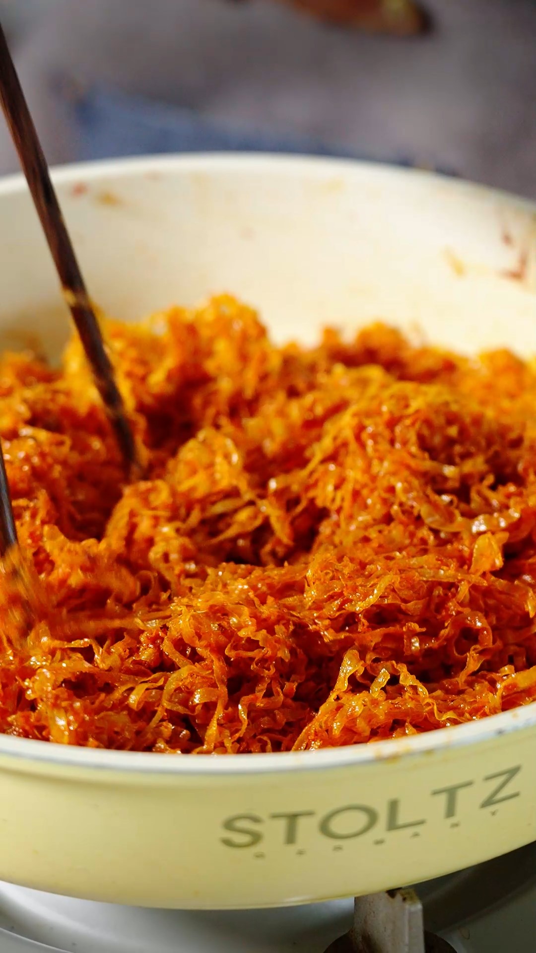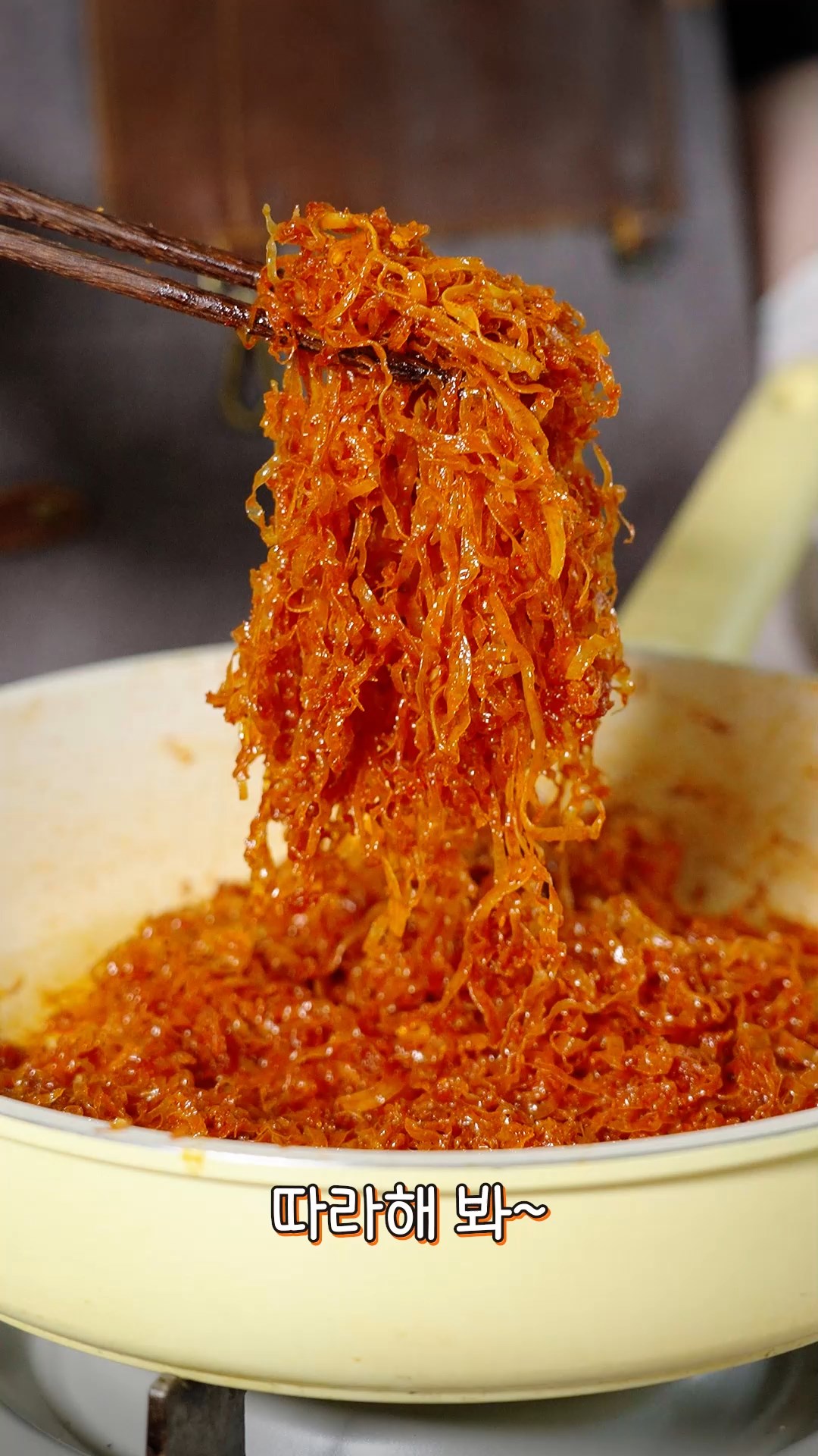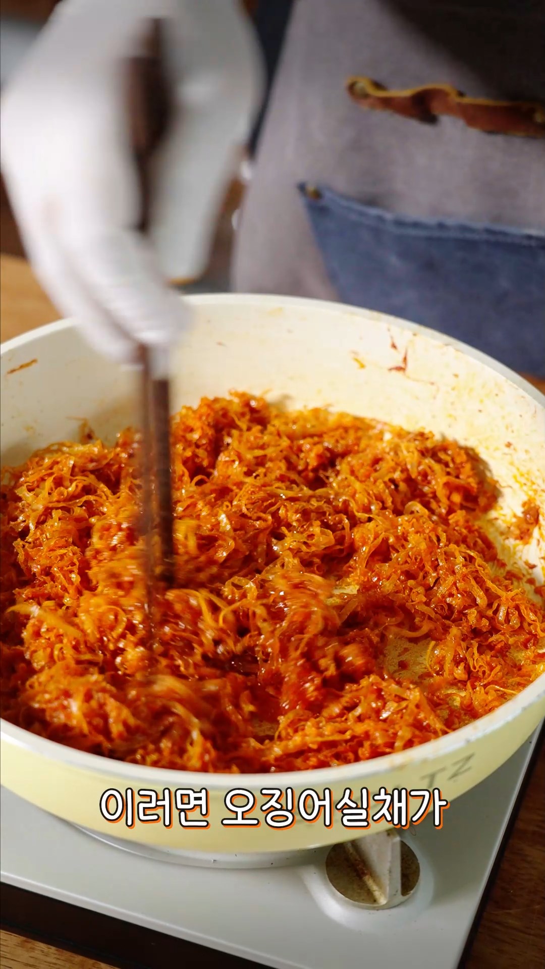 6. 약불로 낮춘 후 오징어 실채를 넣어 젓가락으로 흩치며 볶아주세요.