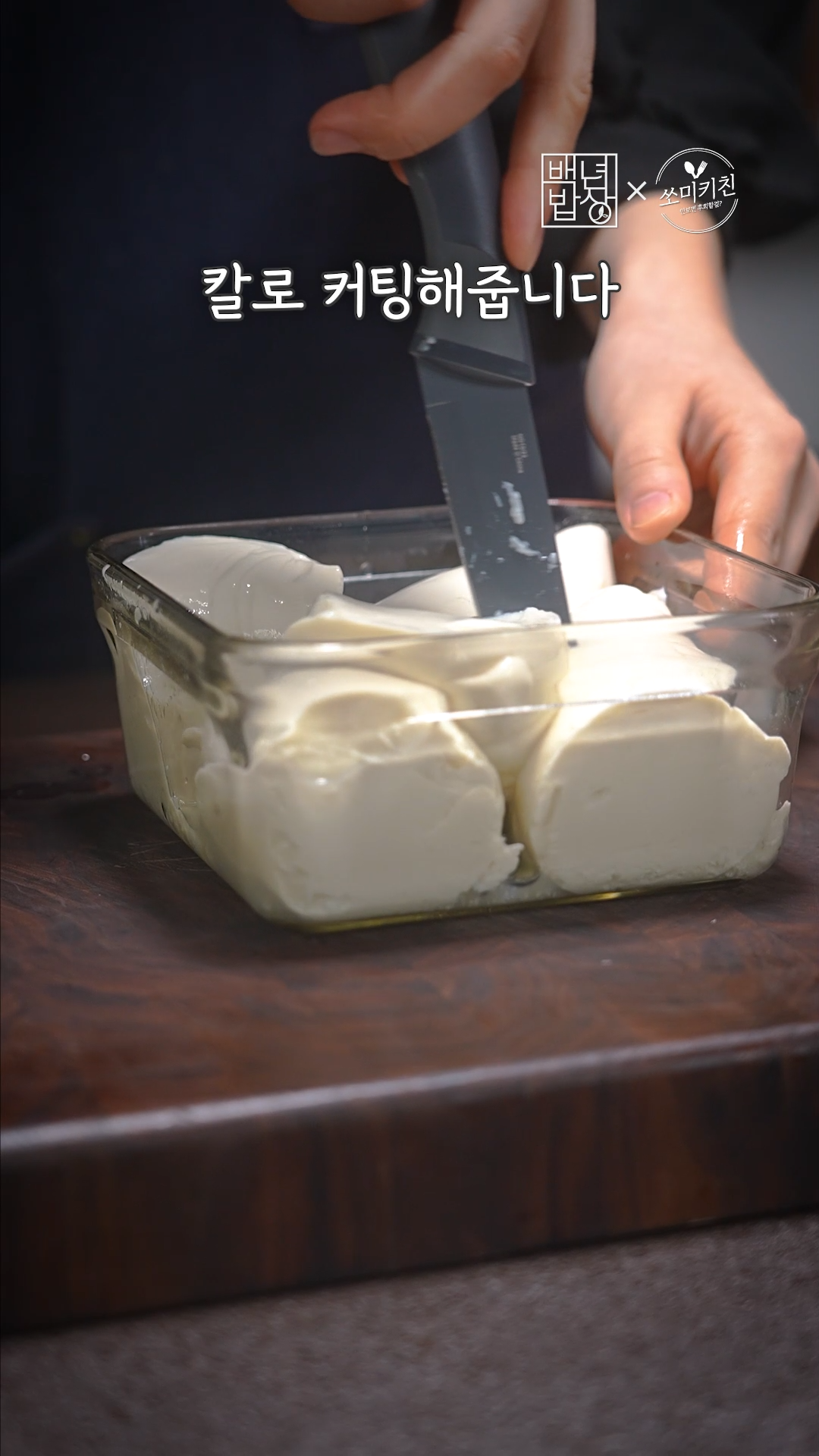 1. 락앤락에 순두부를 반갈라 넣어주고 칼로 컷팅해줄게요.