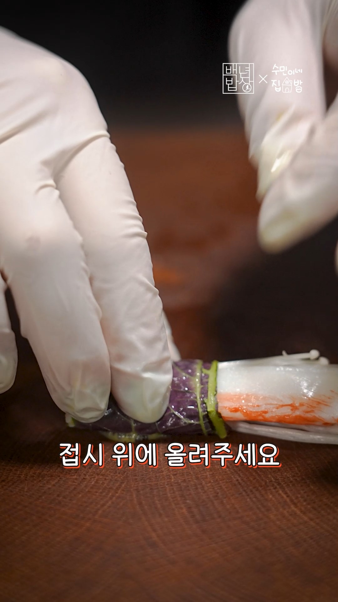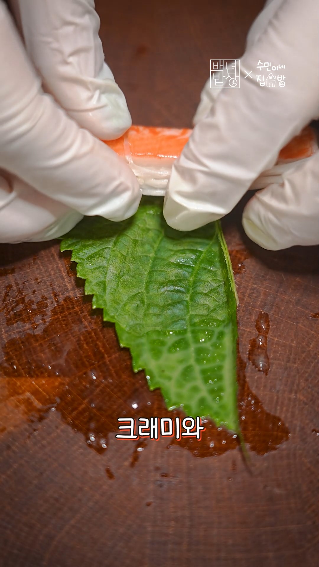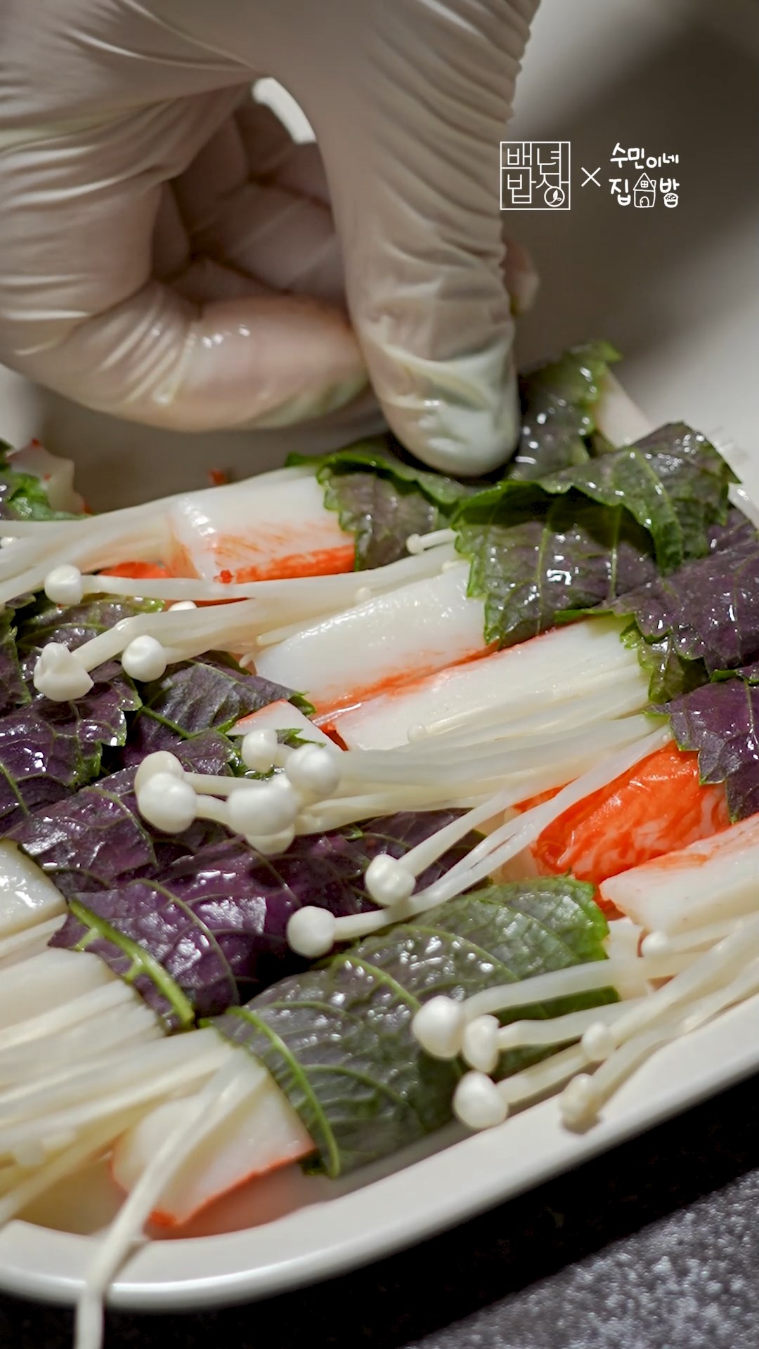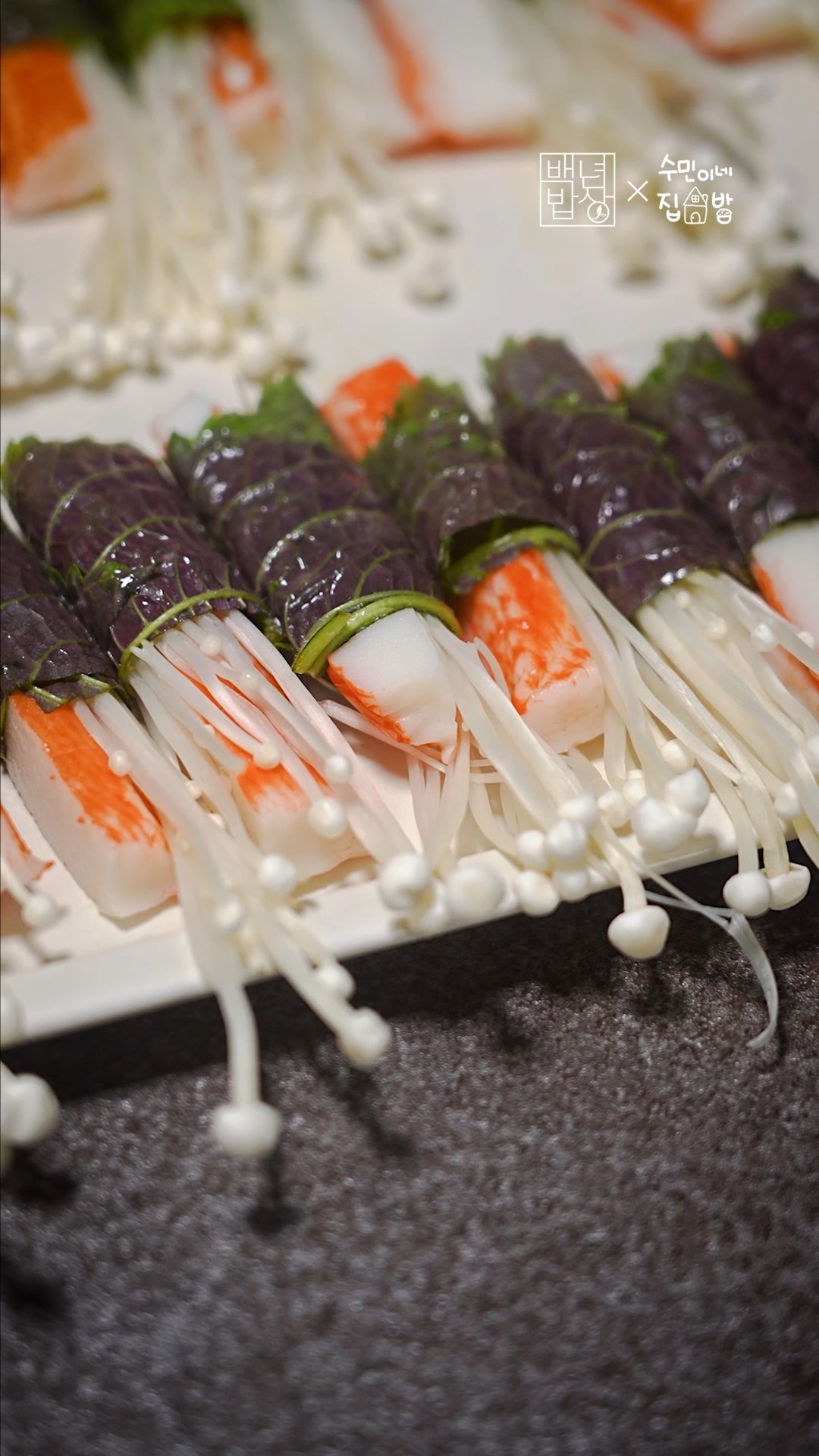 4. 깻잎을 펼치고 크래미와 팽이버섯을 놓고 돌돌 말아주세요.