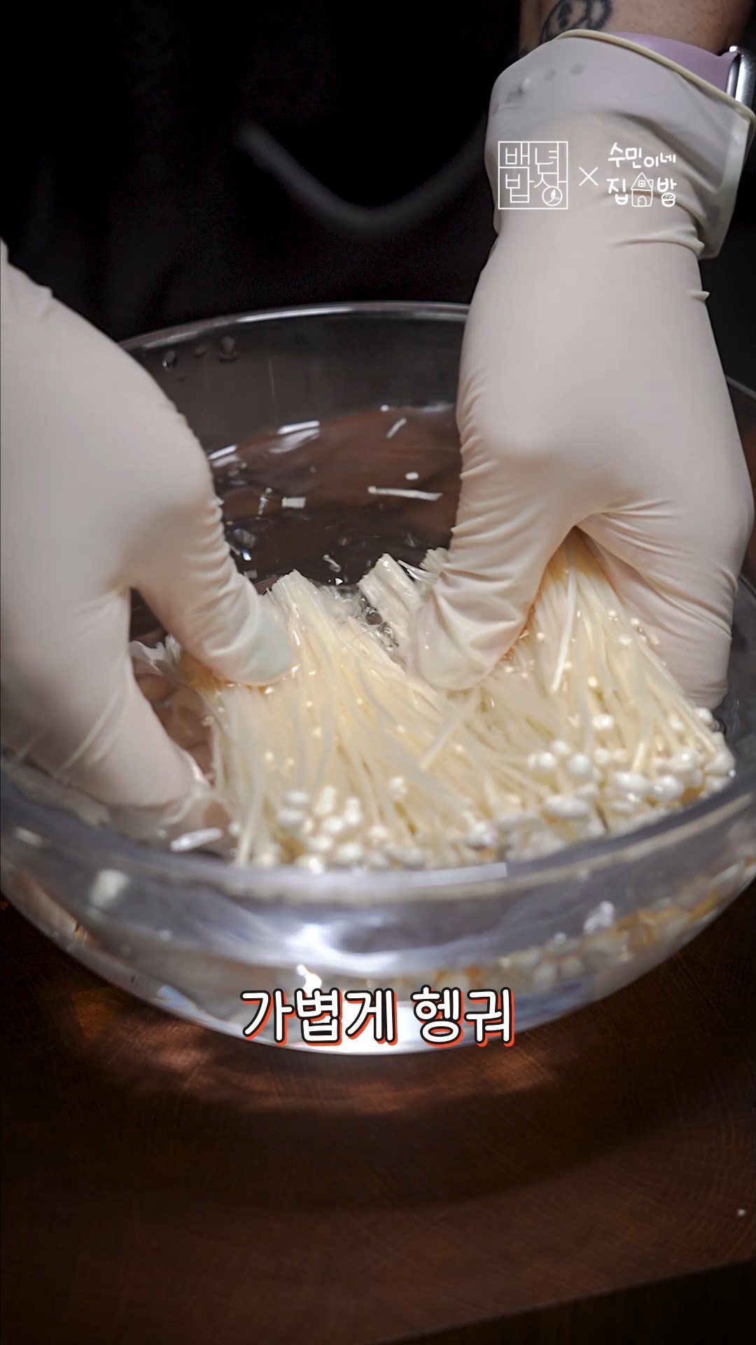 2. 팽이버섯은 밑동 제거 후 가볍게 헹궈 작게 찢어주세요.