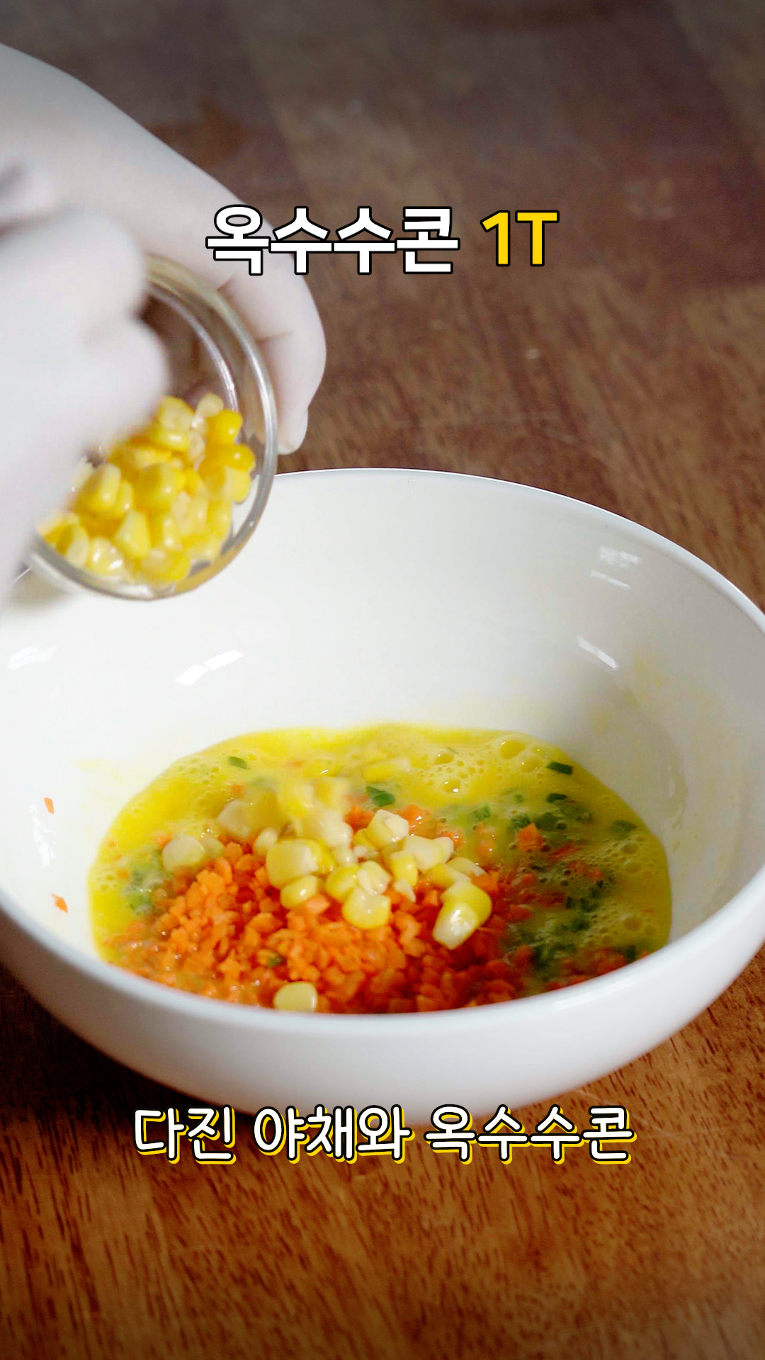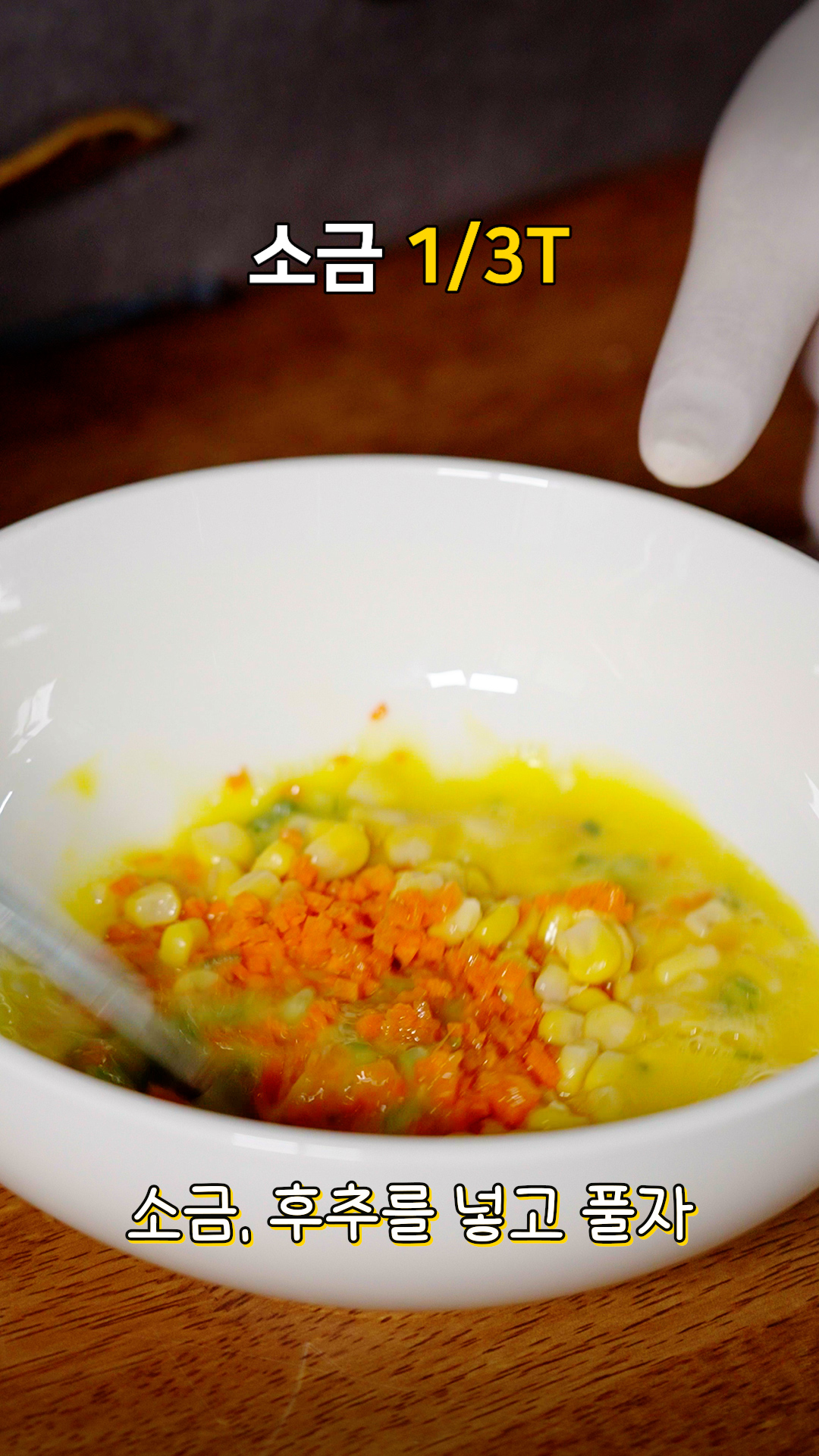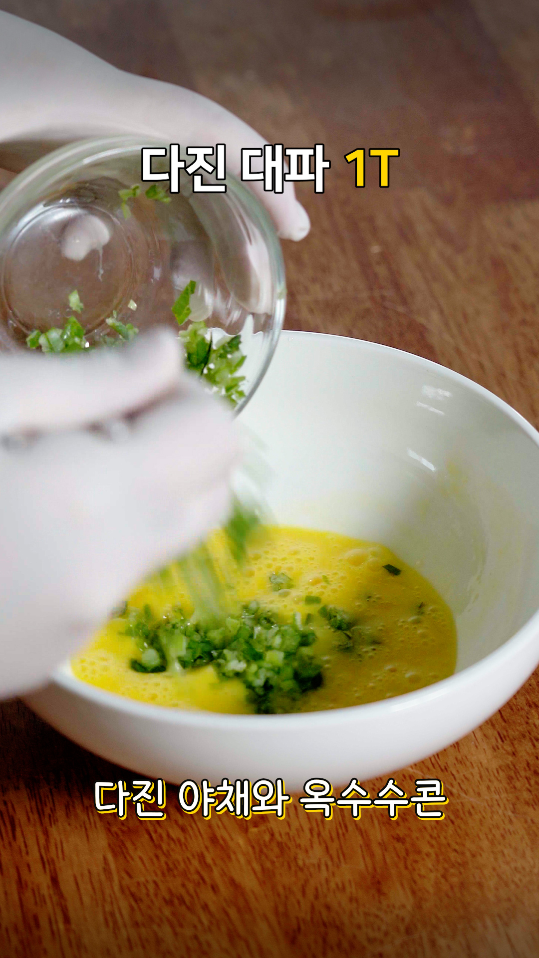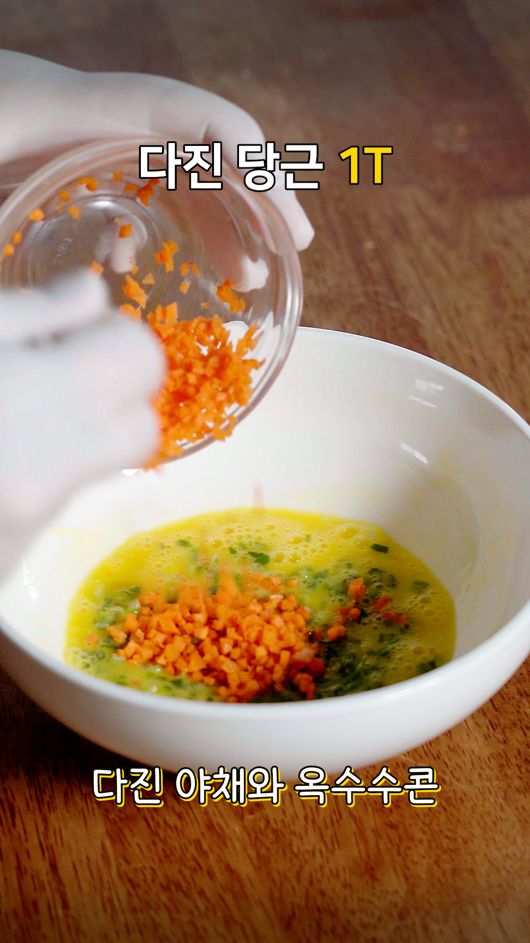 2. 당근, 대파는 너무 곱지 않게 다져 볼에 계란을 깨뜨려 넣고 다진 야채와 옥수수콘, 소금, 후추를 넣어 풀어주세요