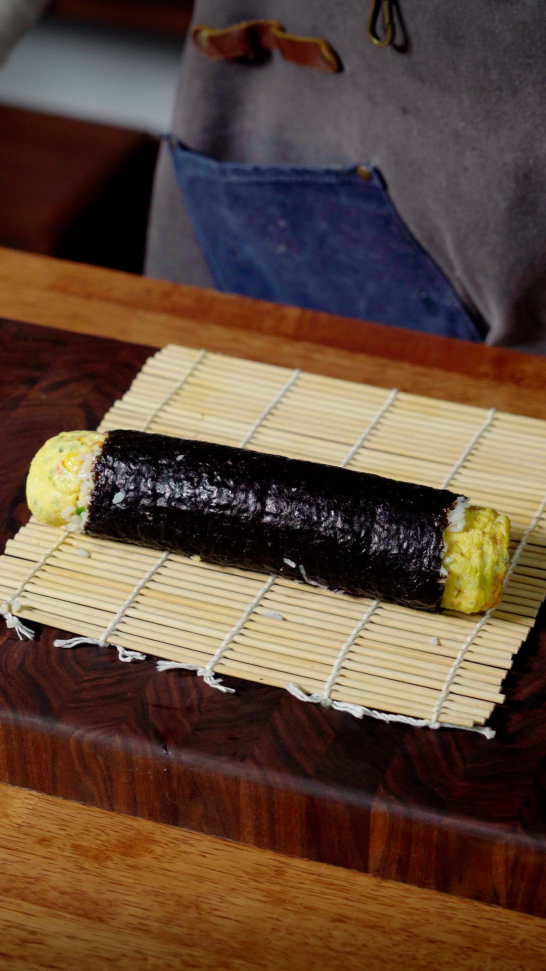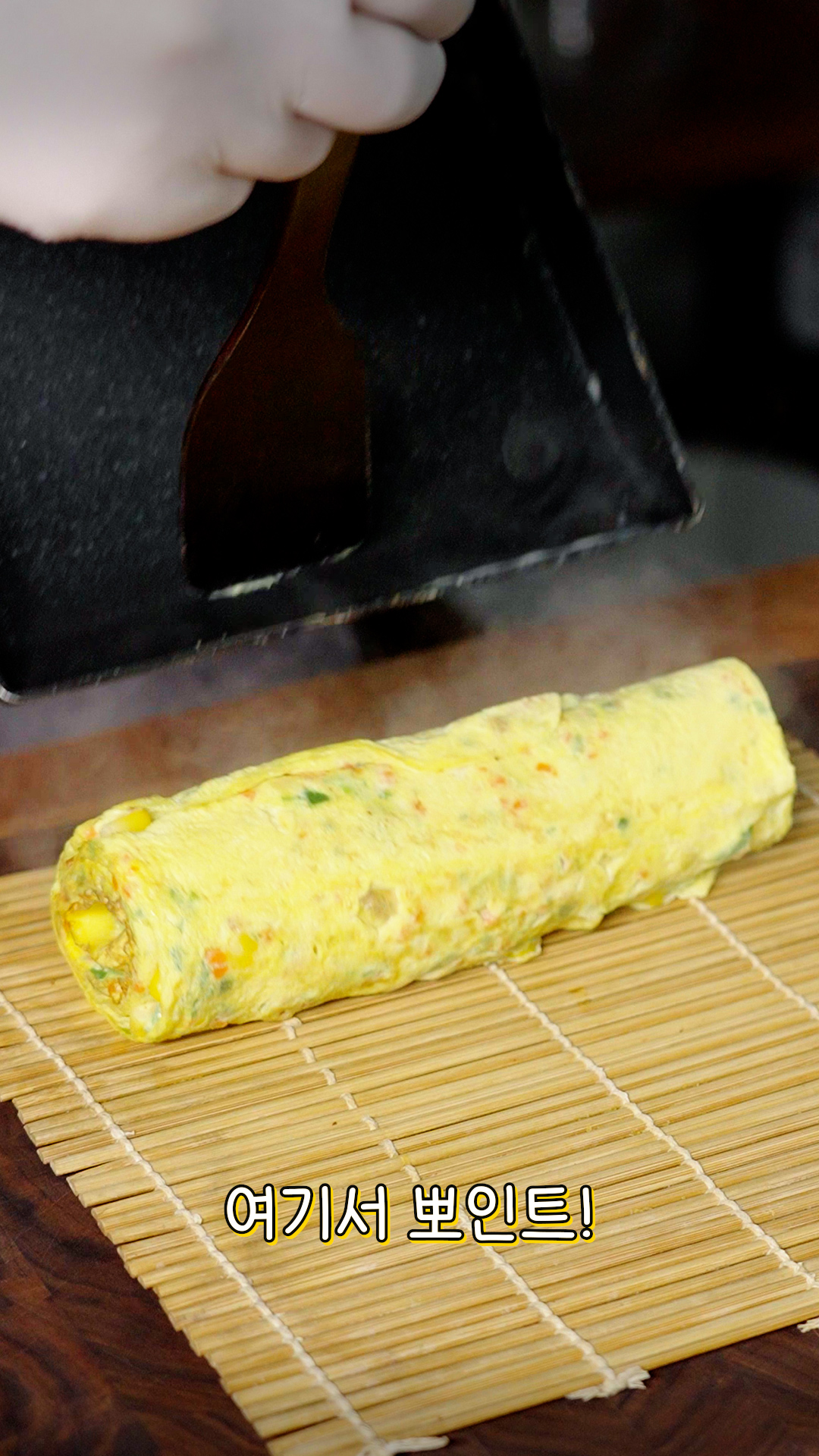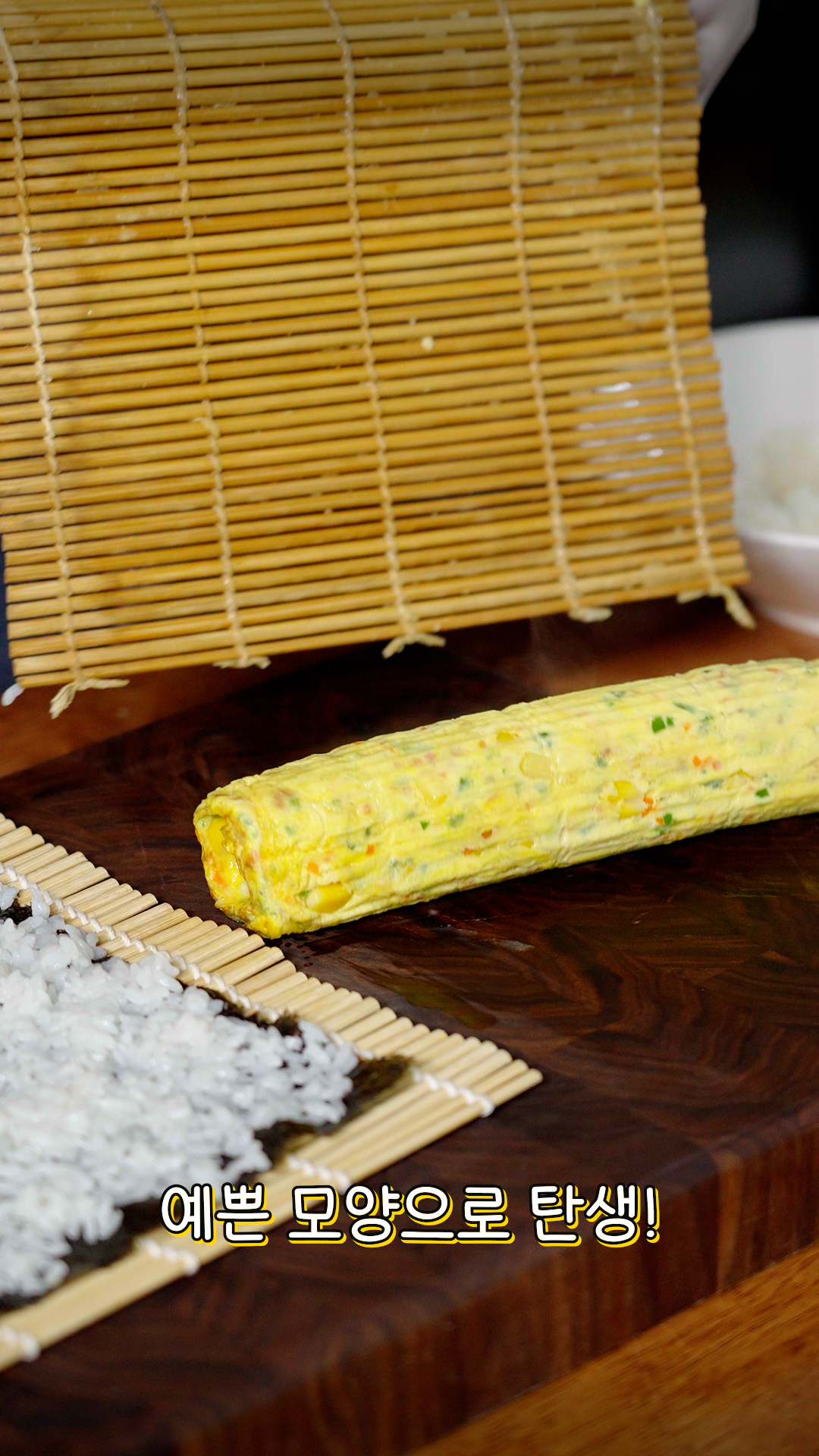 5. 김발에 계란말이를 넣고 돌돌 말아 고정시켜주세요.