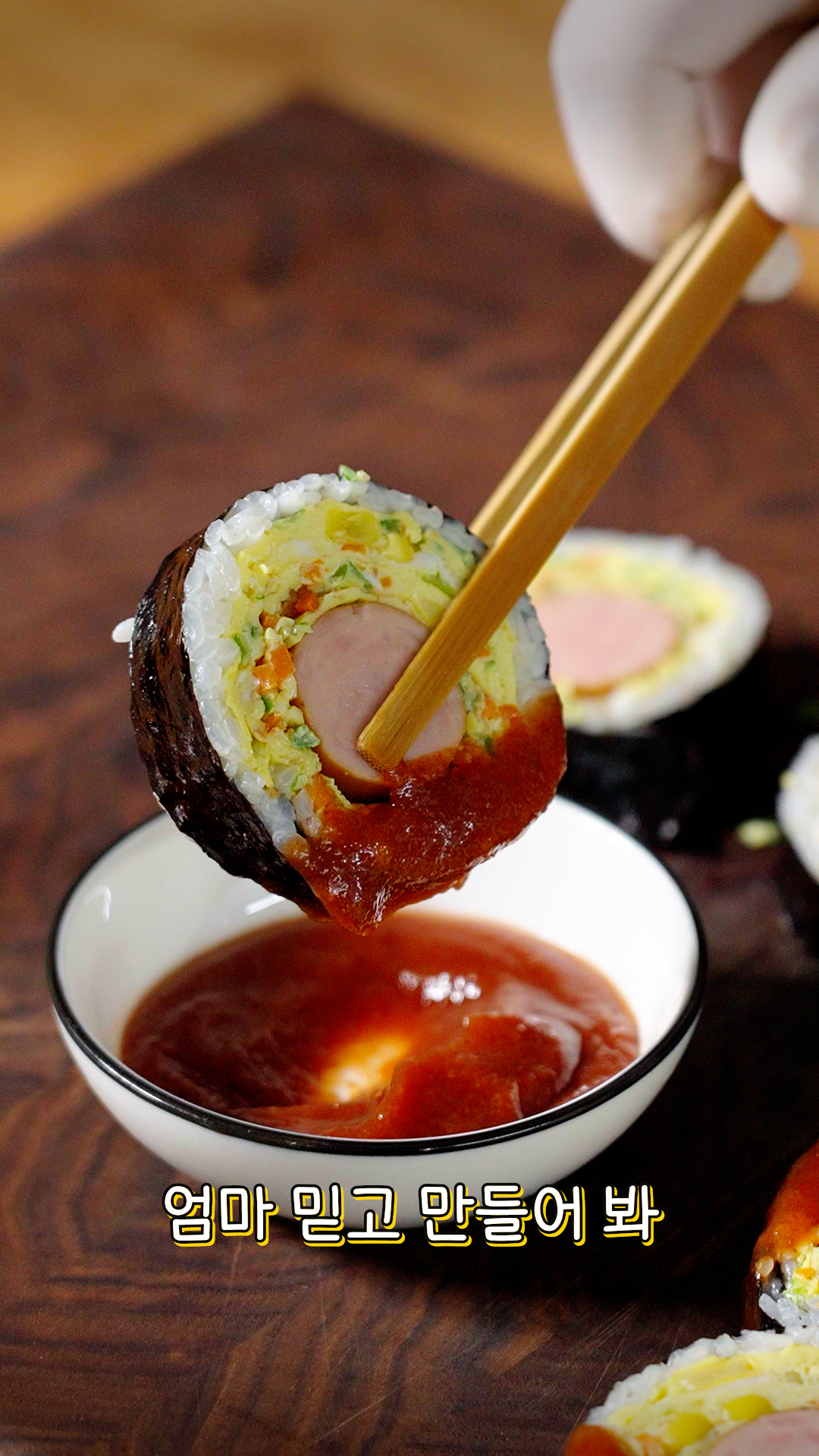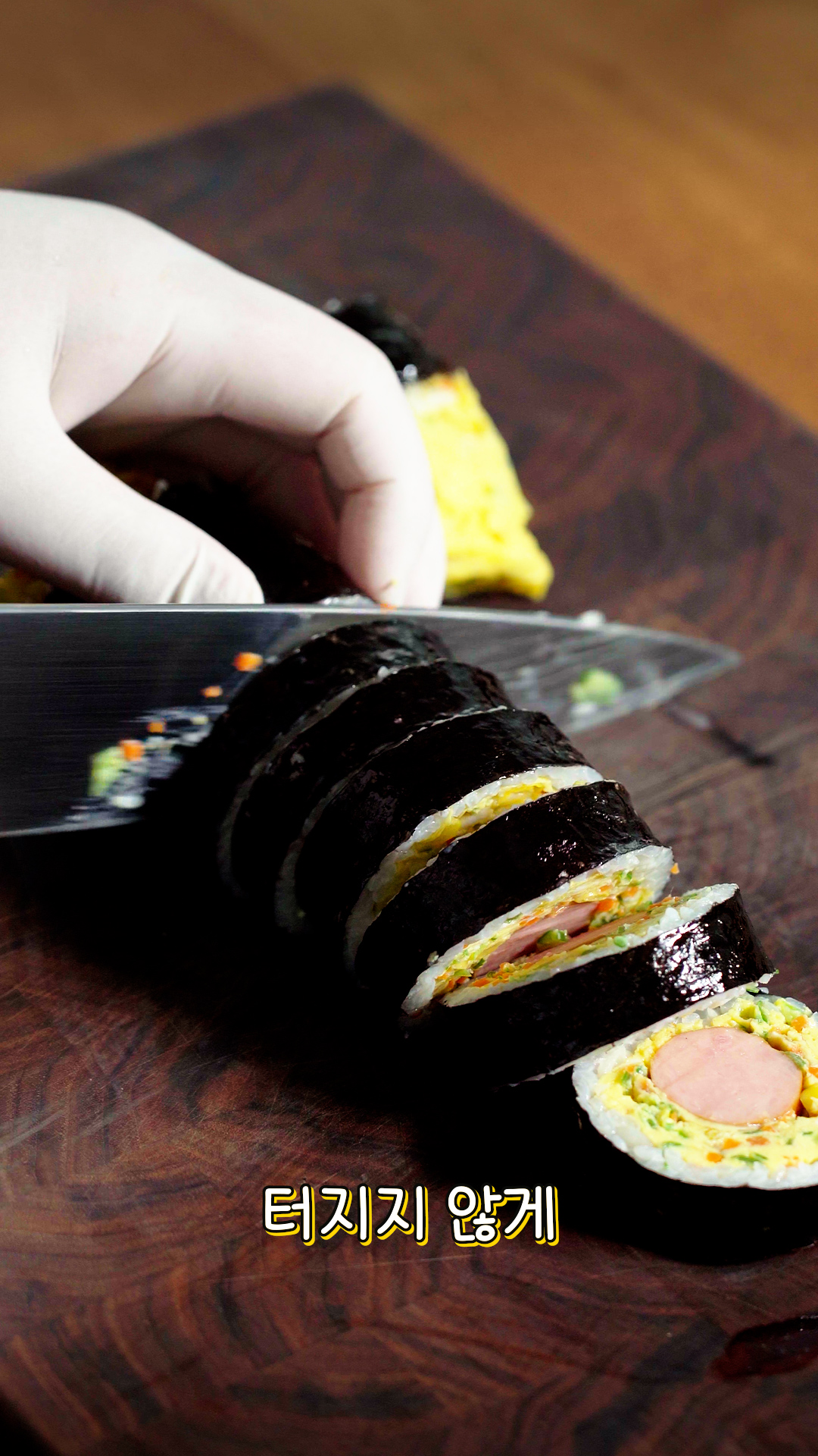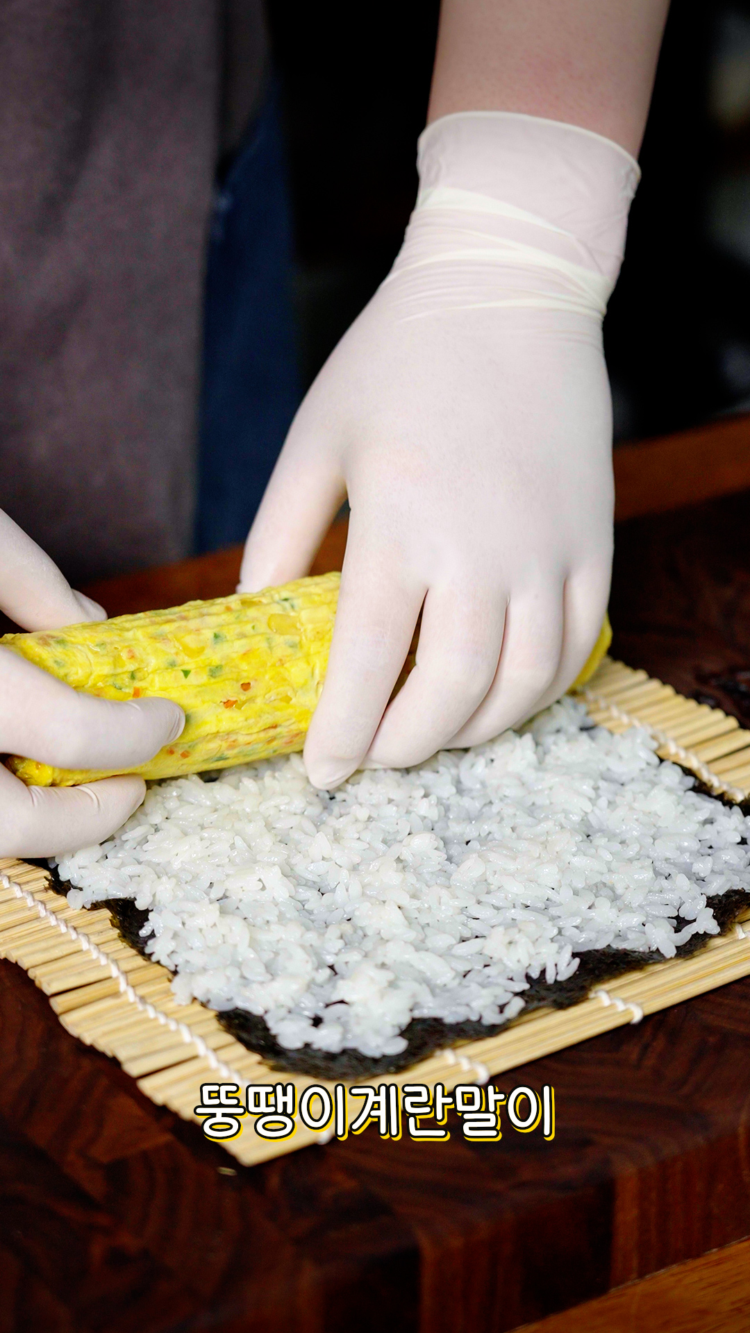 6. 김에 밥을 펼친 후 밥을 깔고 계란말이를 얹어 말아주면 완성!