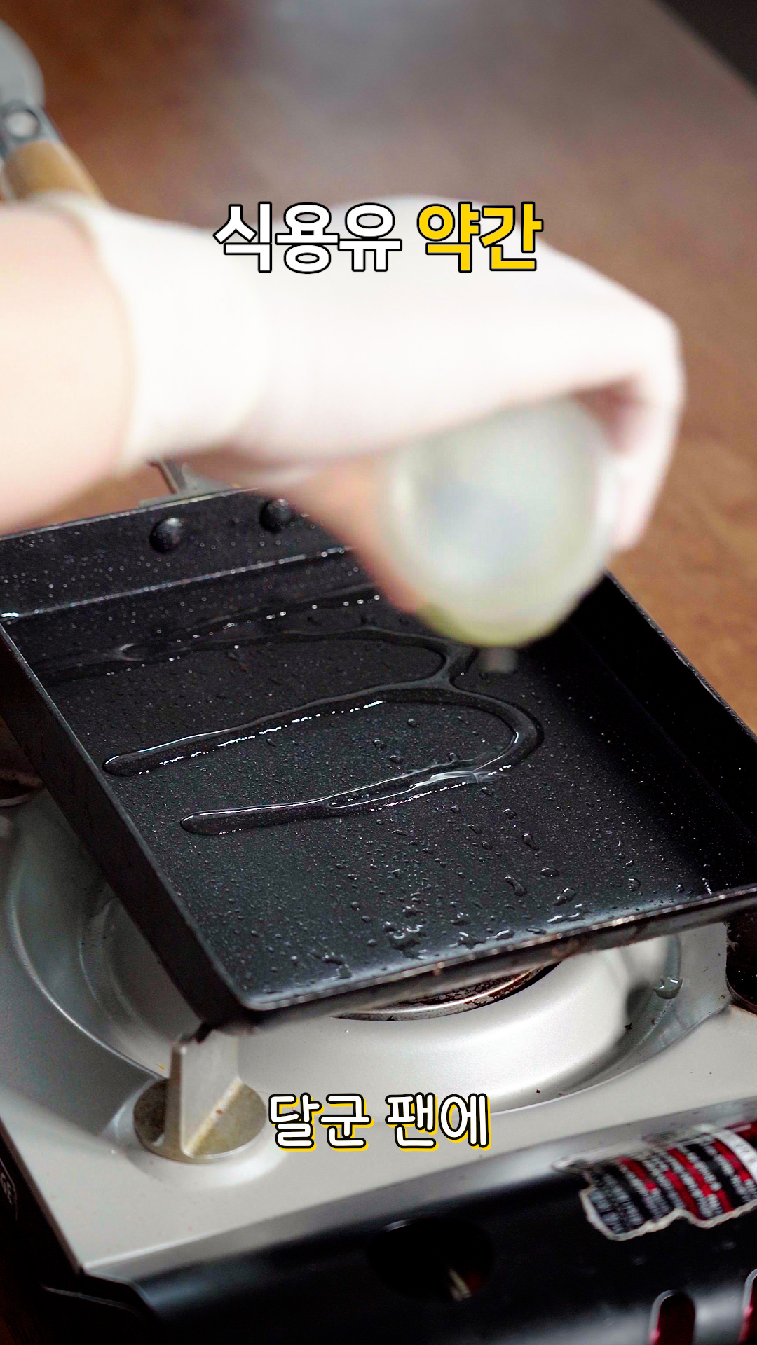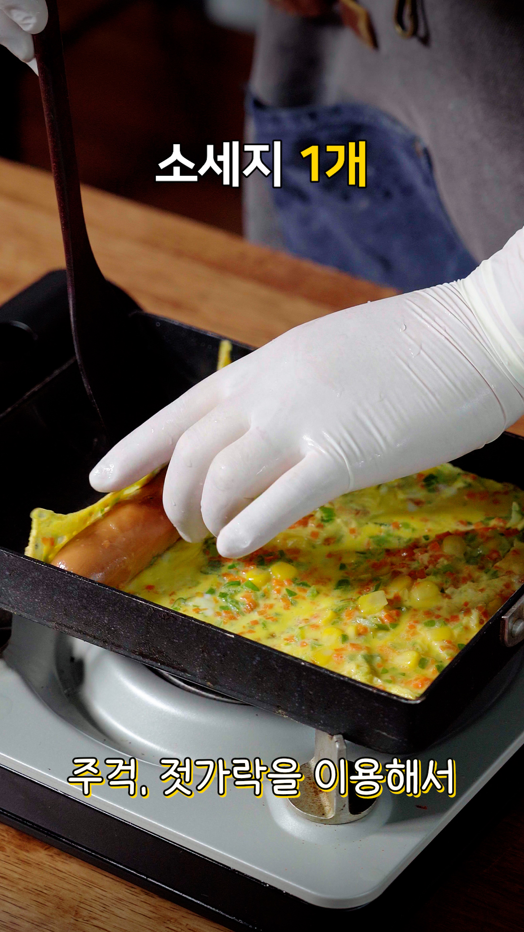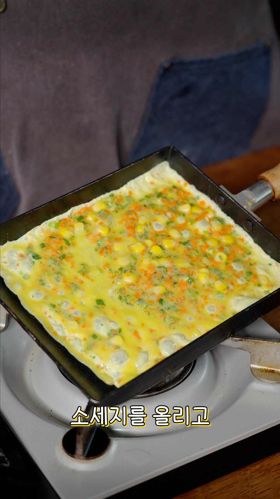 3. 팬에 기름을 바른 후 계란물 1/3을 먼저 넣고 펼쳐준 뒤 소세지를 중앙에 올리고 말아주세요.