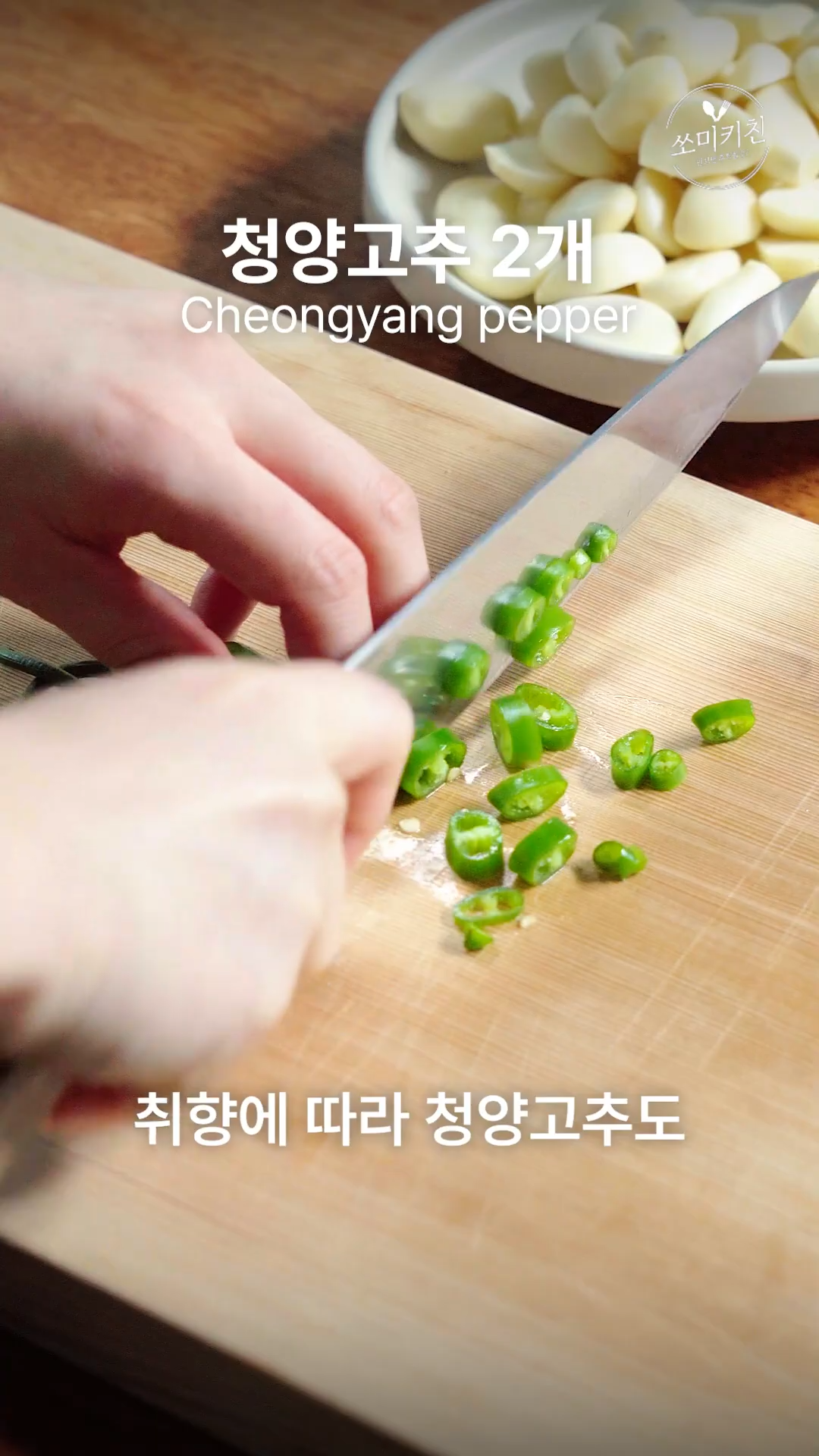 1. 먼저 마늘200g은 꼭지떼고 적당한 크기로 편썰고 청양고추도 썰어주세요.