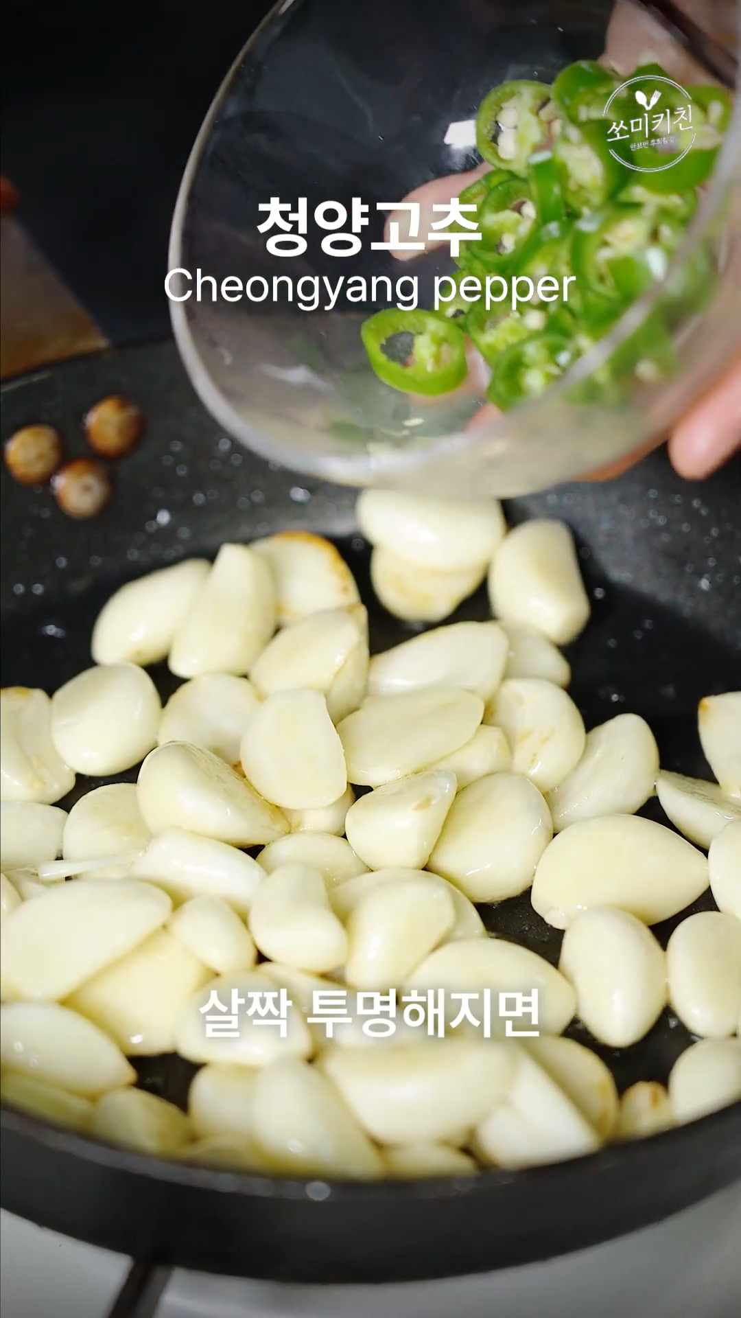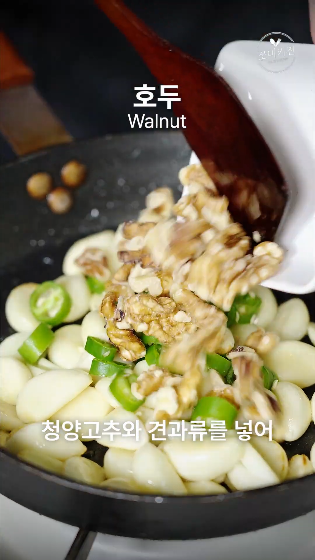 3. 팬에 기름을 두르고 마늘을 넣고 볶다가 살짝 투명해지면 청양고추와 견과류를 넣어 복아주세요.