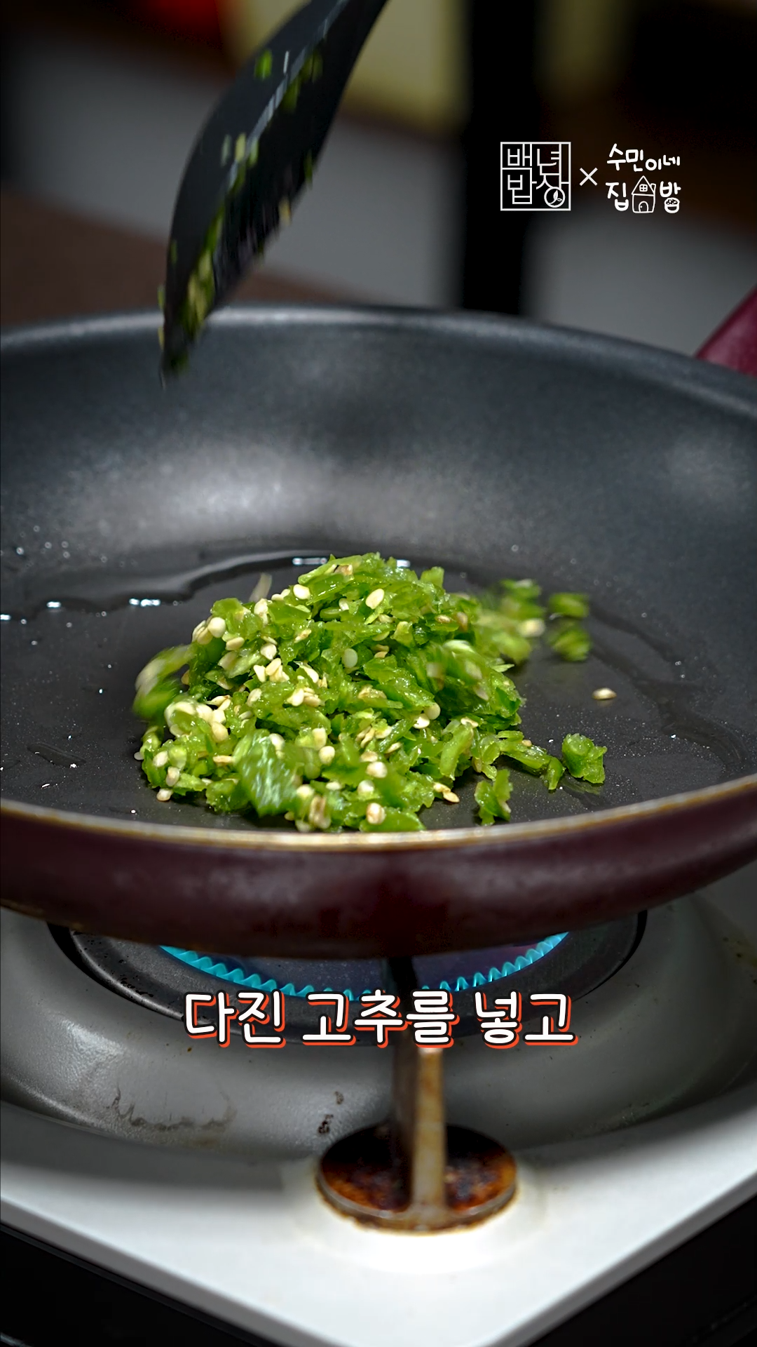 2. 팬에 기름 살짝 두르고 다진 고추를 넣고 볶아주세요.