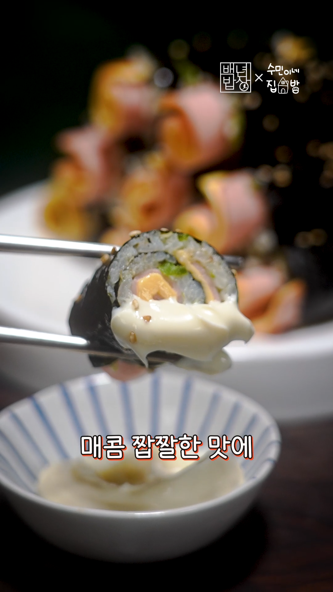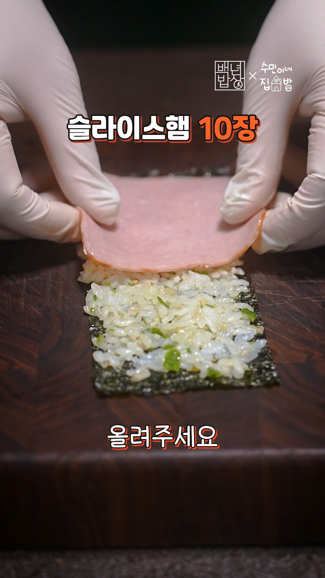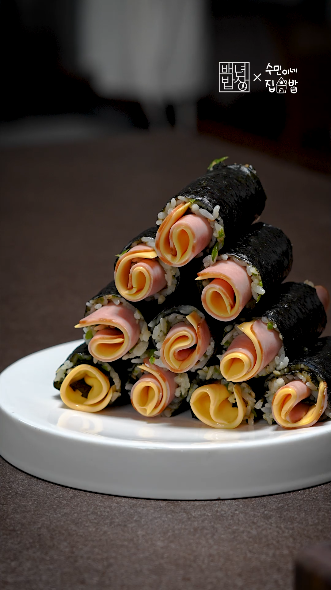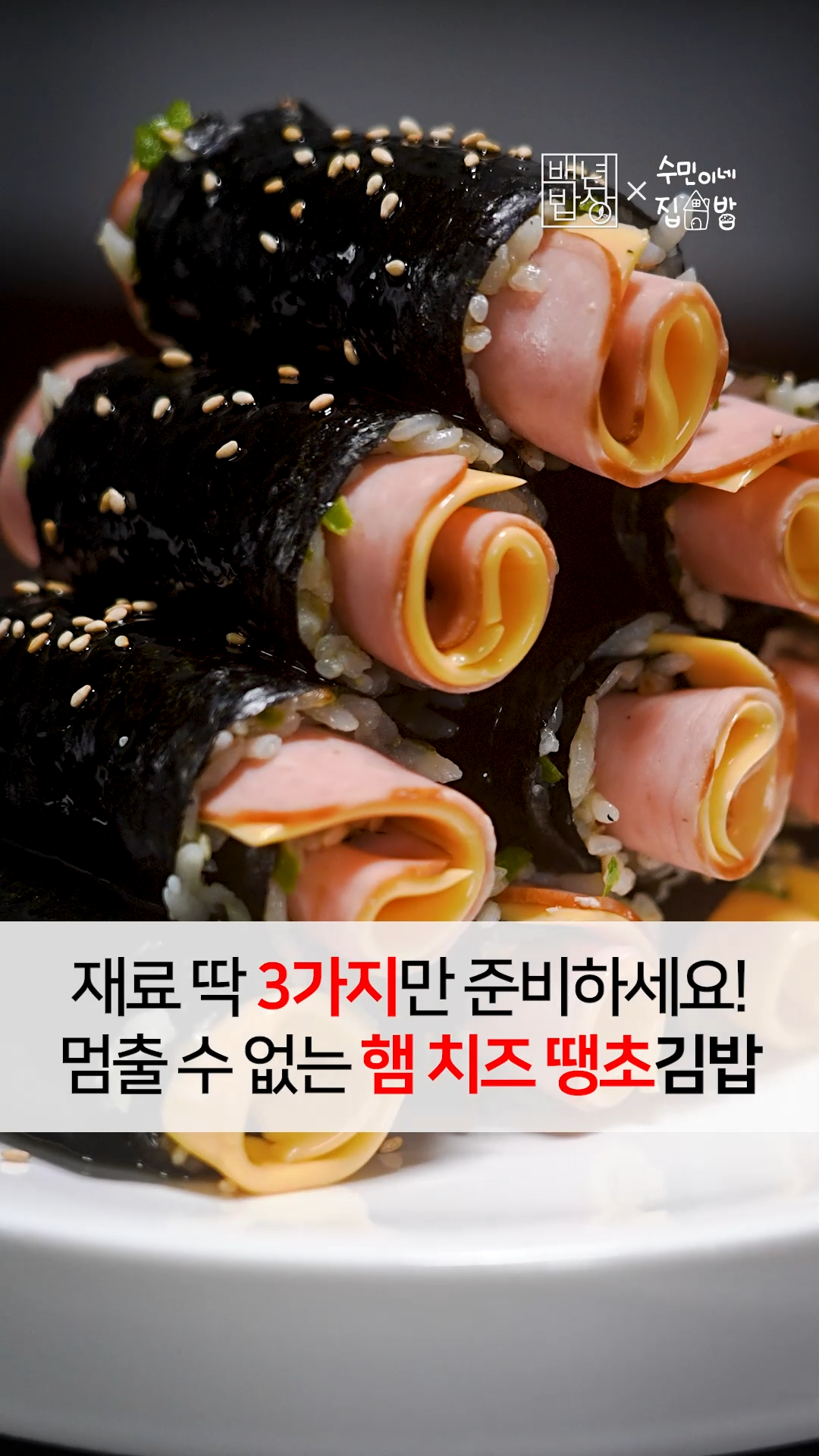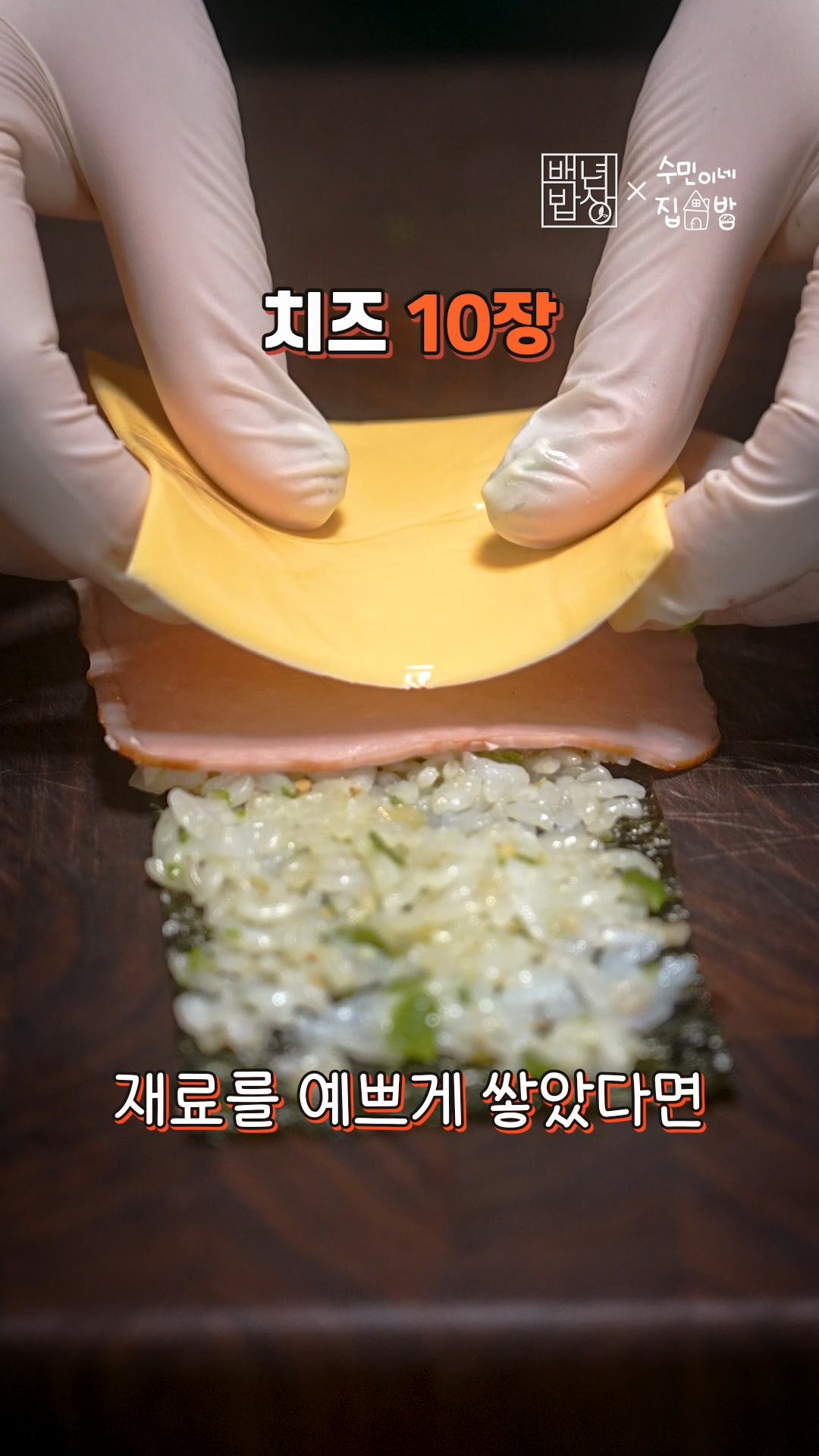 5. 3등분으로 자른 김 위에 밥을 깔고 슬라이스 햄, 치즈를 올려 돌돌 말아주면 완성!