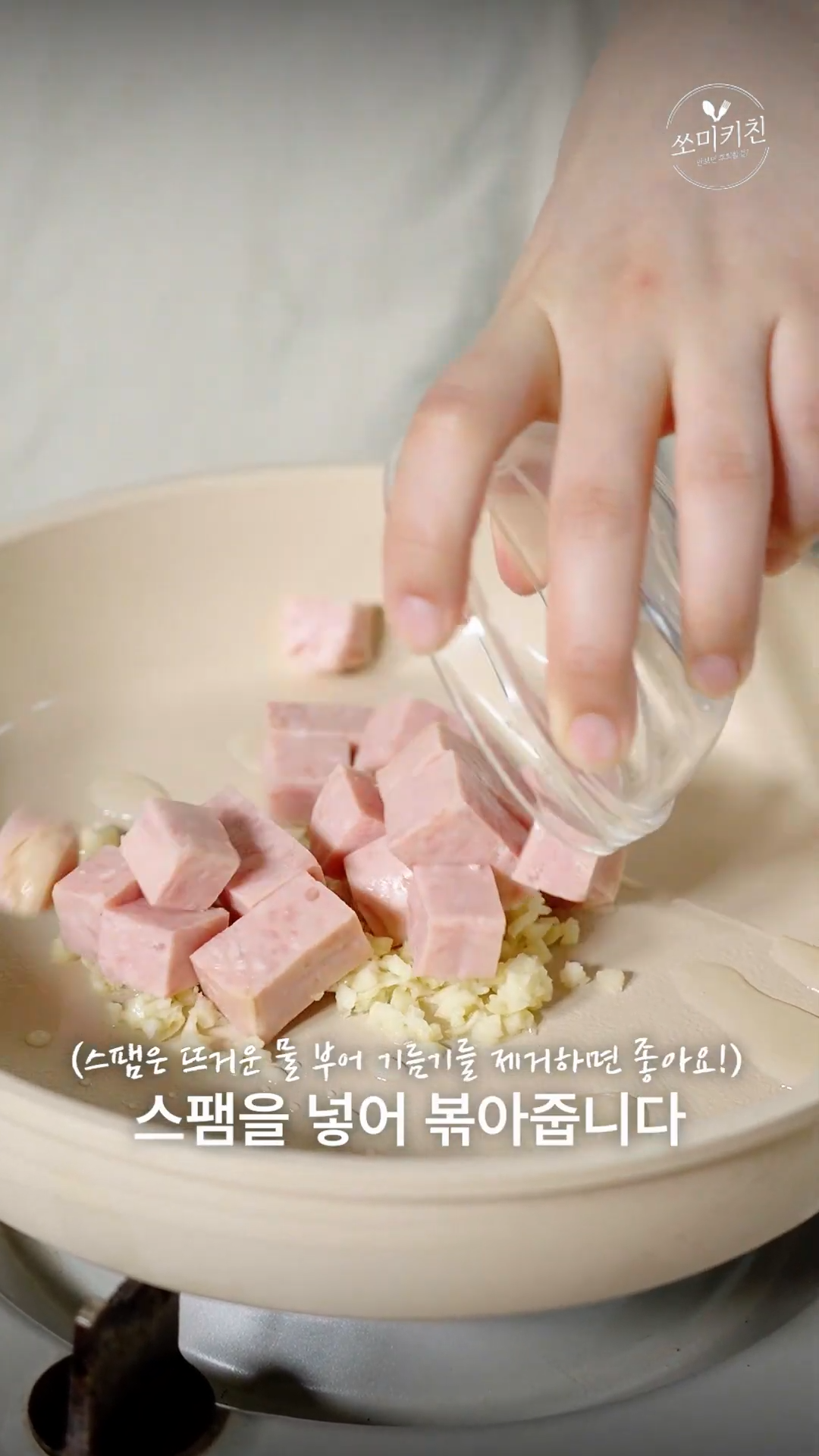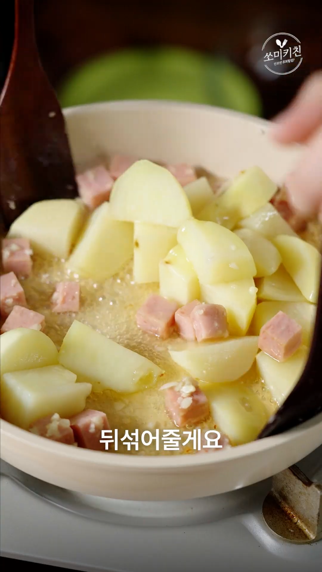 5. 팬에 기름을 두르고 다진마늘과 스팸을 볶아주다 기름이 살짝 나오면 감자를 넣고 볶은 뒤 뚜껑을 닫고 5분간 감자 속 까지 익혀주세요.