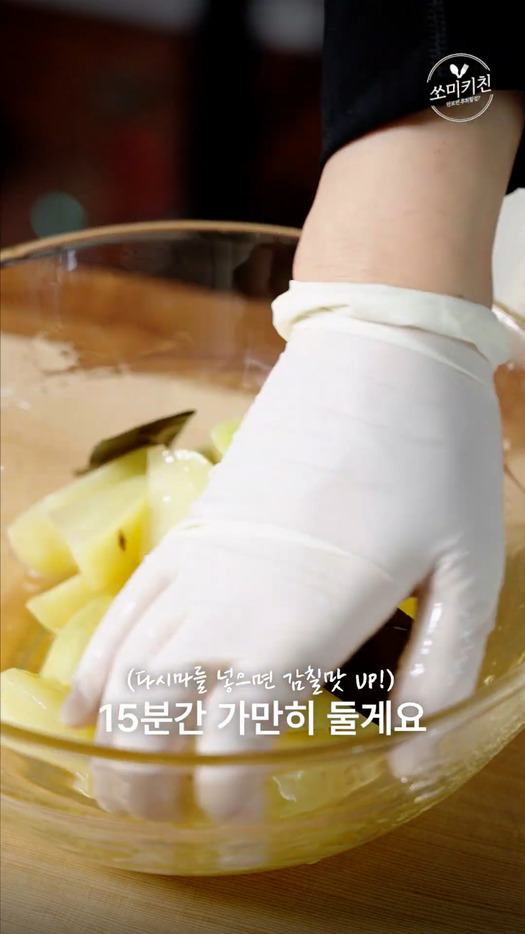 3. 볼에 감자를 담고 조청,올리고당,다시마를 넣어 버무려 15분간 절여주세요.