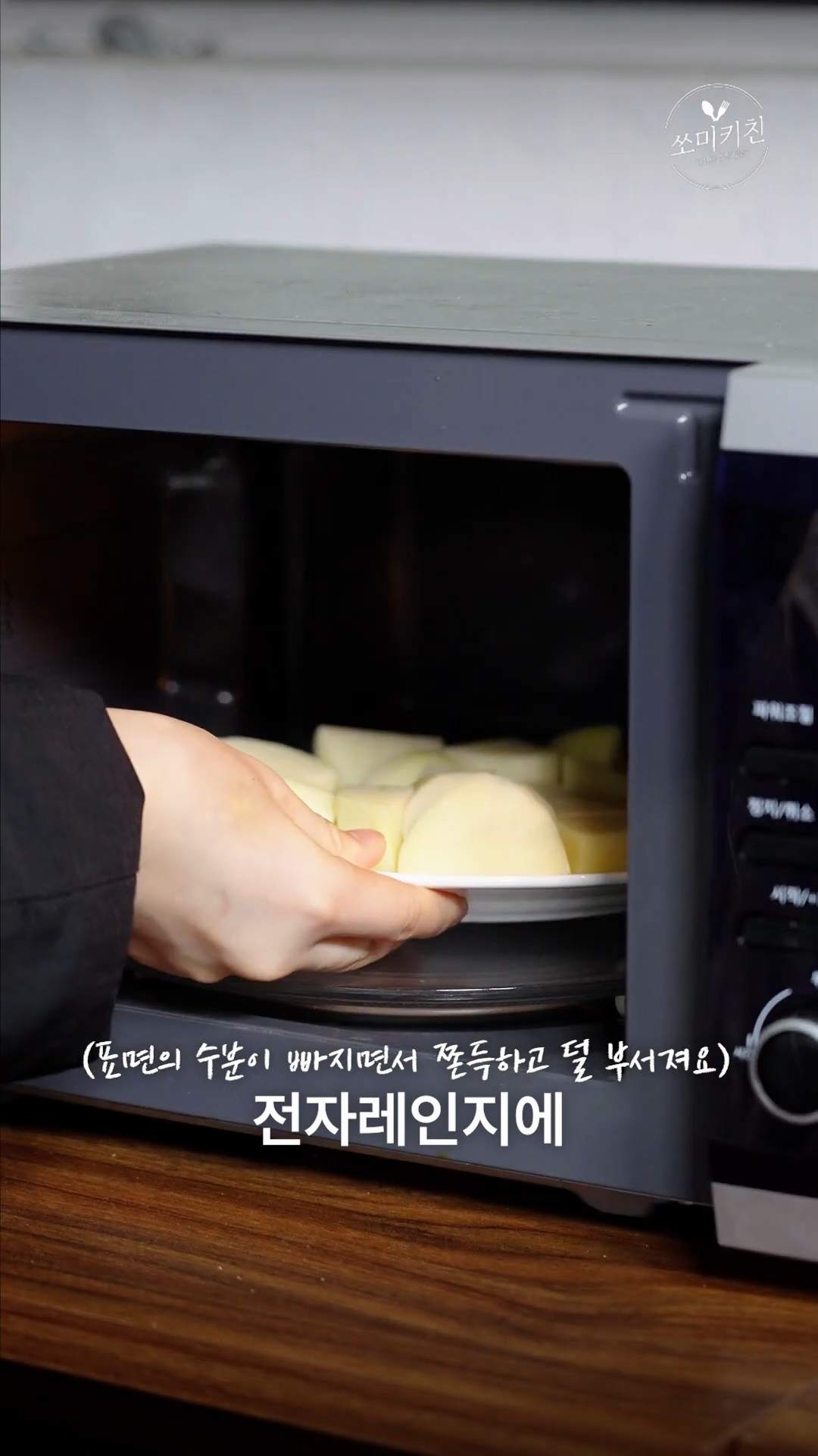 2. 접시에 감자를 펼친 후 전자레인지에 3분간 익혀주세요.