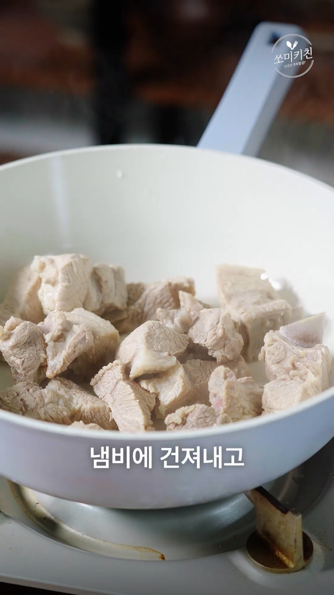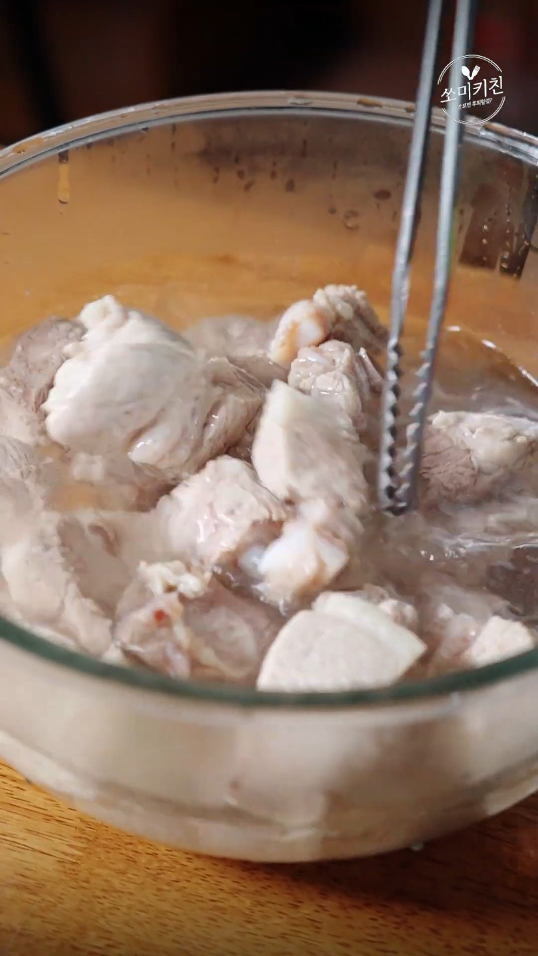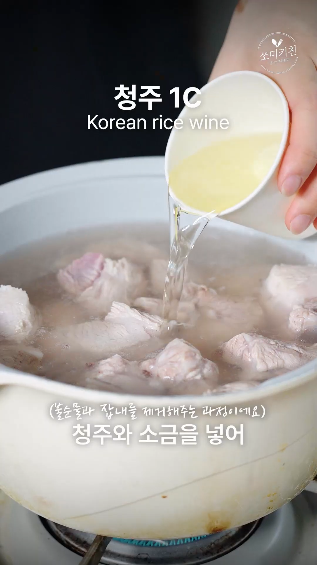 2. 핏물을 뺀 갈비는 헹궈준 후, 끓는물에 넣고 청주 1C와 소금1T을 넣어 15분간 삶아 헹궈주세요.