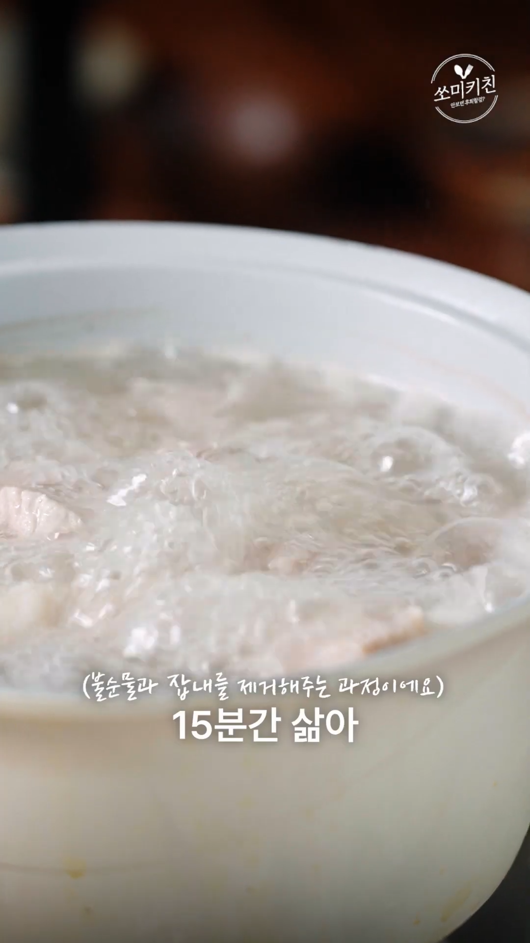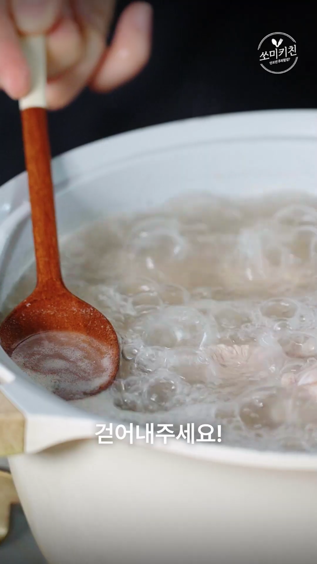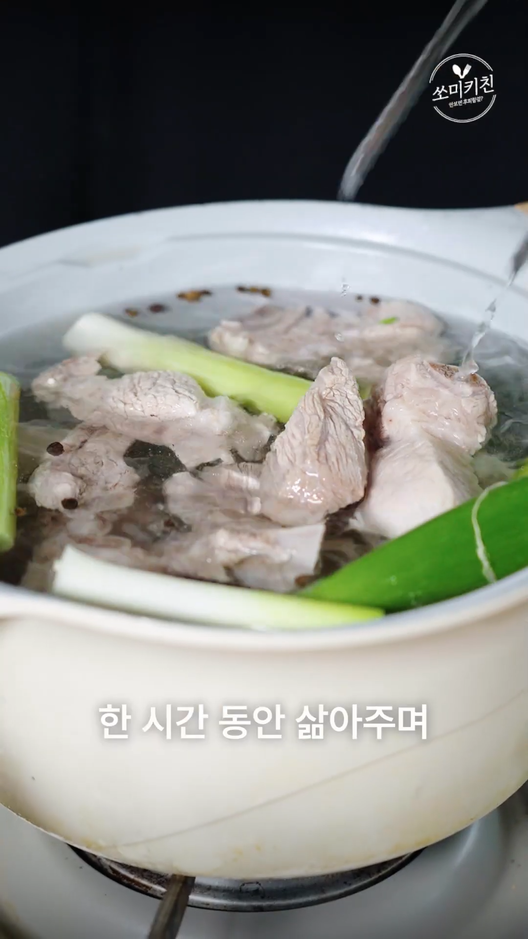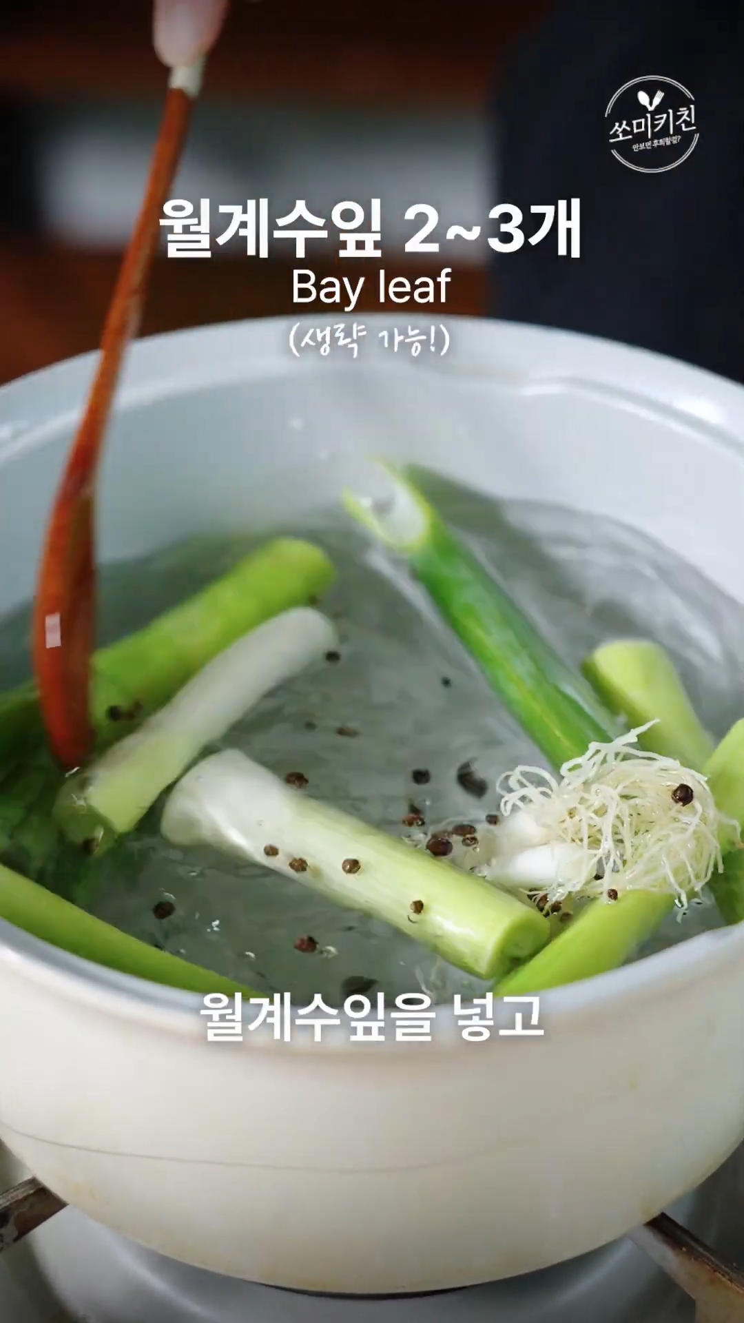3. 물 1.5L, 대파2대, 통후추 1/2T, 월계수잎2-3개를 넣고 1시간동안 삶아주며 중간에 거품은 걷어내주세요.