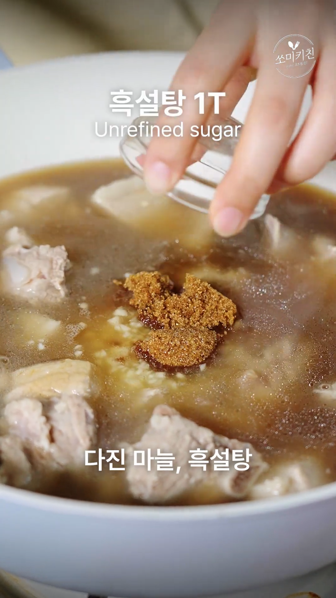 5. 갈비를 건져내준 후, 삶은물을 체에 거른 뒤 간장 1C, 물엿 1C, 배음료 1C, 다진마늘 2T, 흑설탕 1T, 후추 1/2t,를 넣어 조림물이 끓으면 재료를 넣고 국물이 자박해질때까지 졸여주세요.