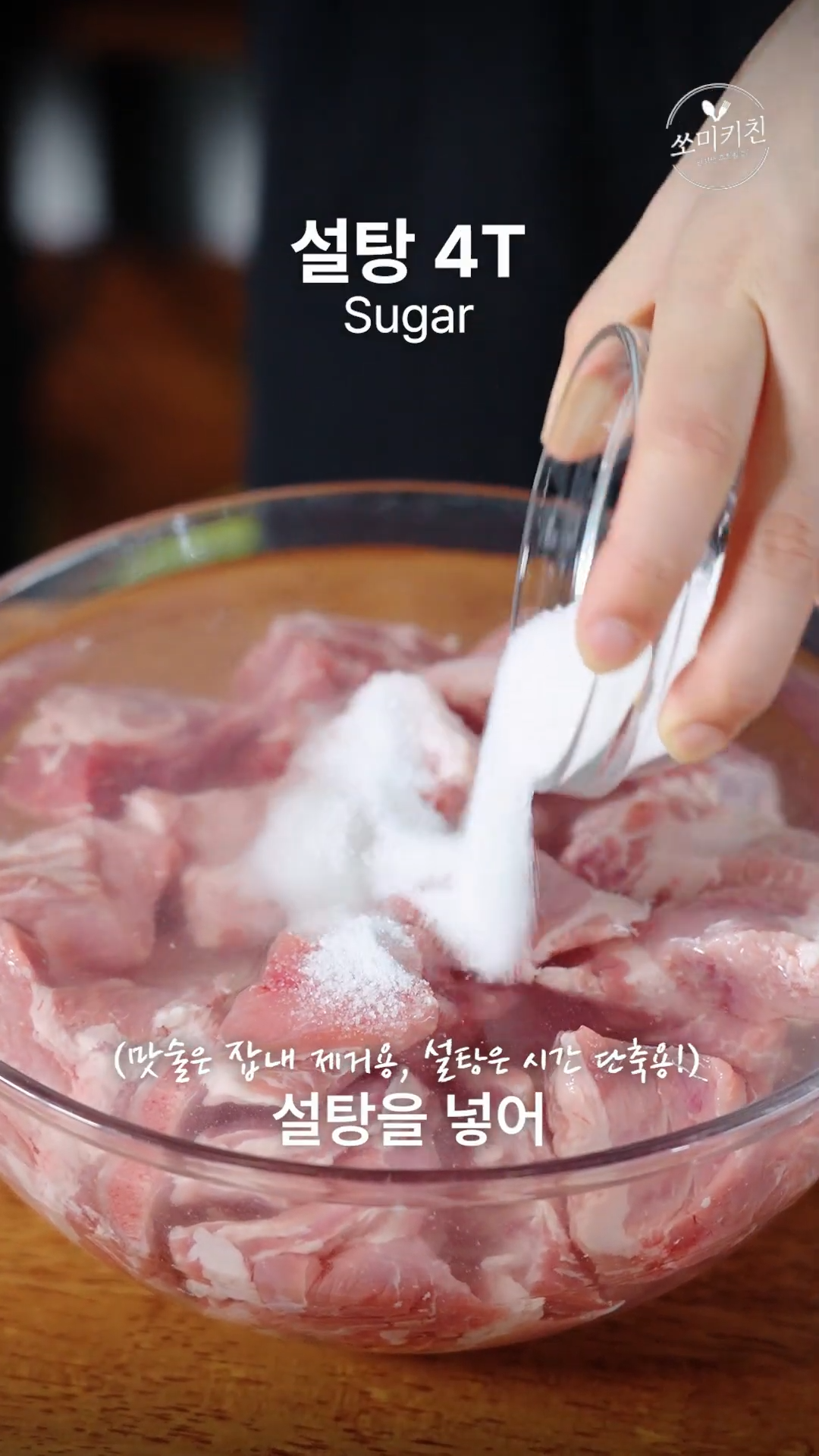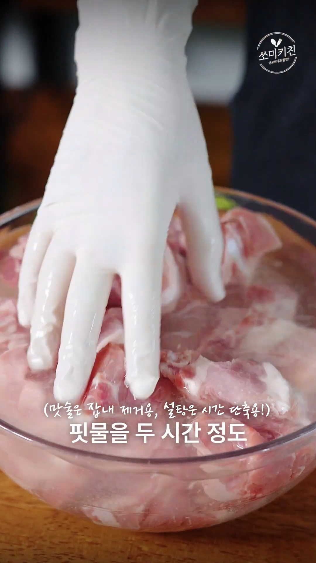 1. 돼지갈비 1kg에 물 1.5L와 맛술2T, 설탕4T를 넣어 핏물을 2시간정도 빼주세요.