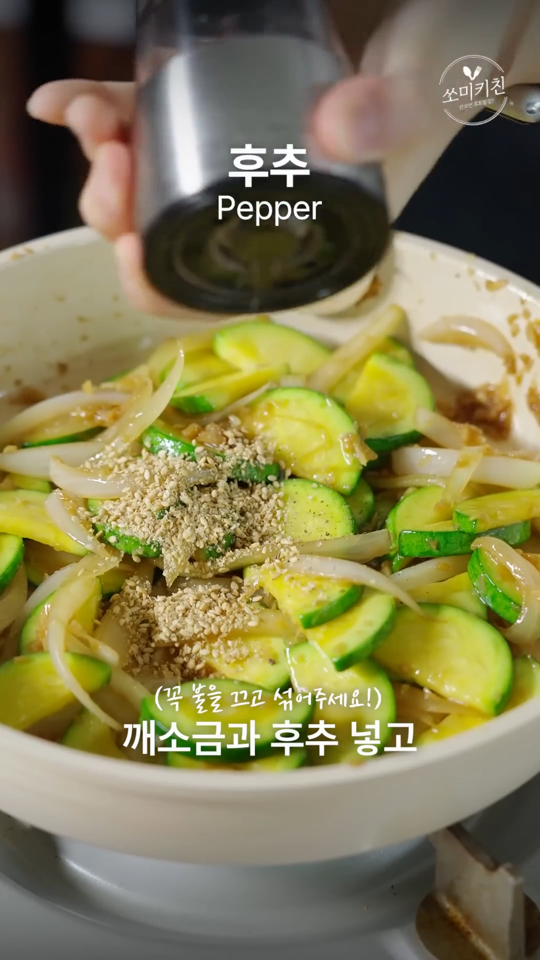 6. 애호박을 넣고 섞은 뒤 깨소금과 후추를 넣고 섞으면 완성!