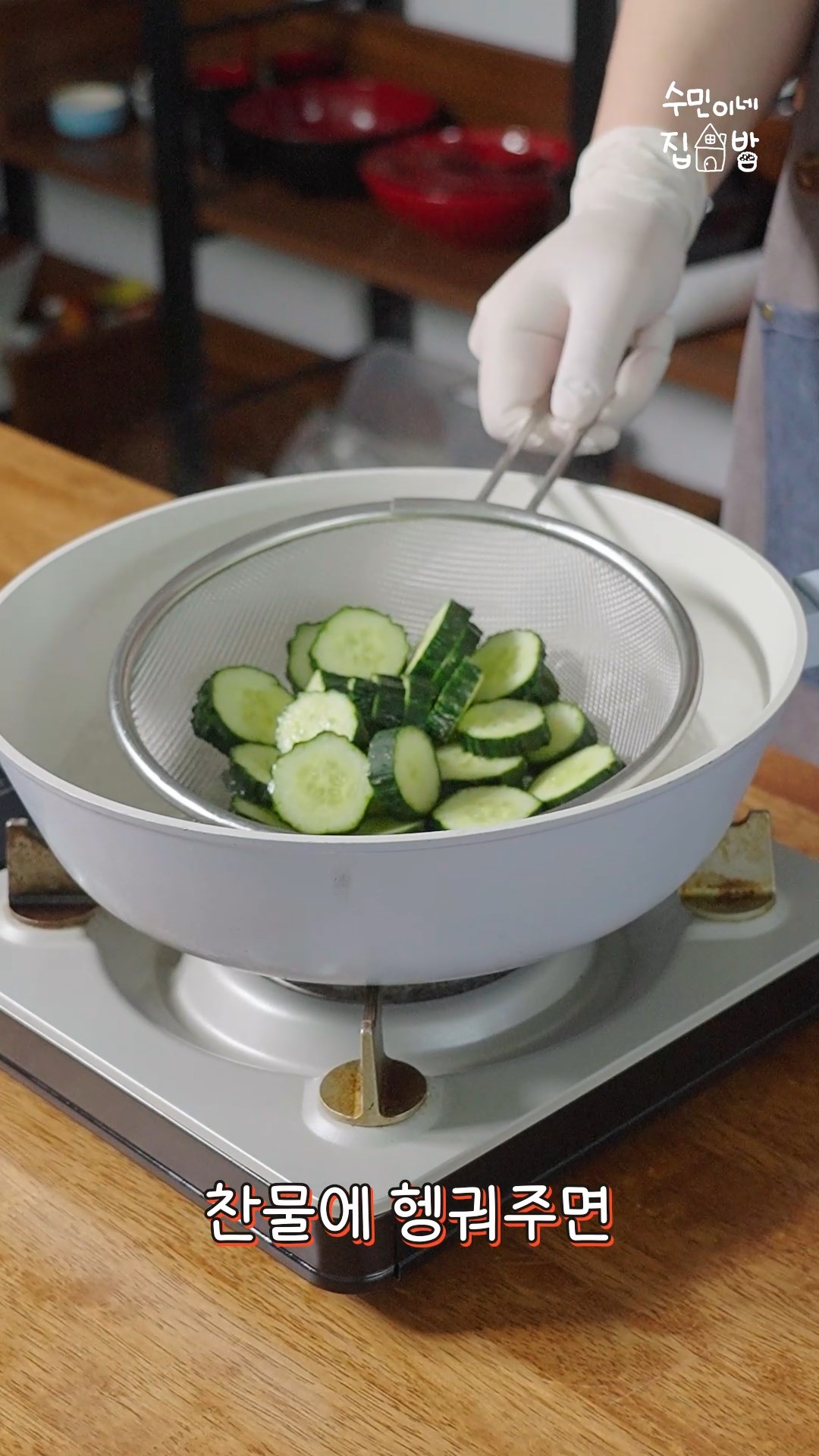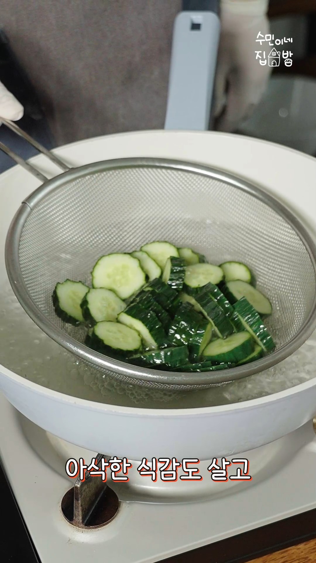 2. 끓는 물에 오이를 데친 뒤 찬물에 헹궈주세요.