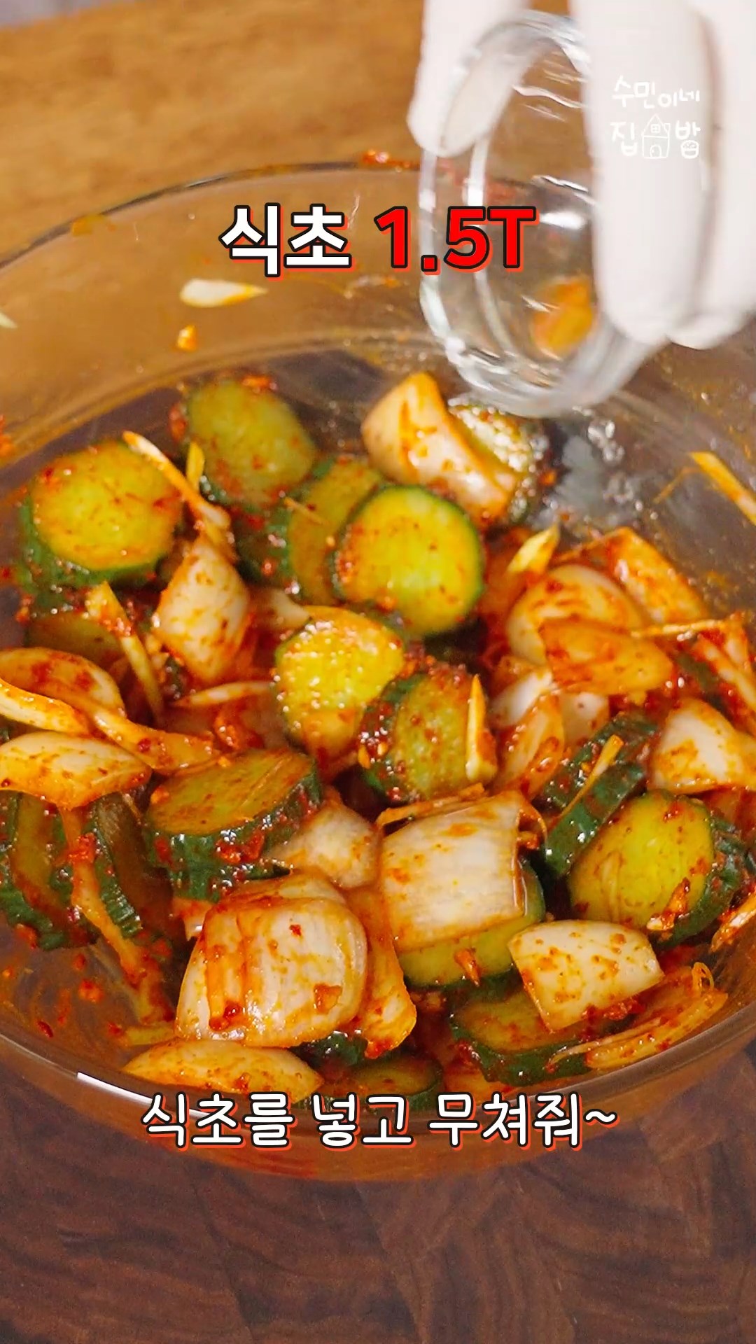 6. 그릇에 오이,양파,대파,양념을 넣고 무치다가 마지막에 식초를 넣고 무쳐주세요.