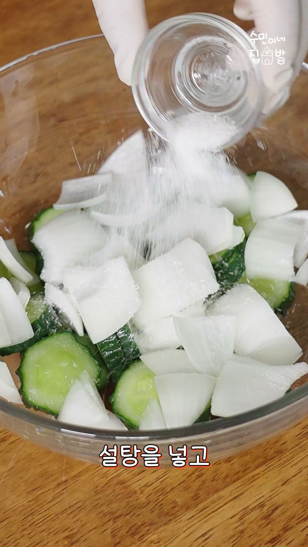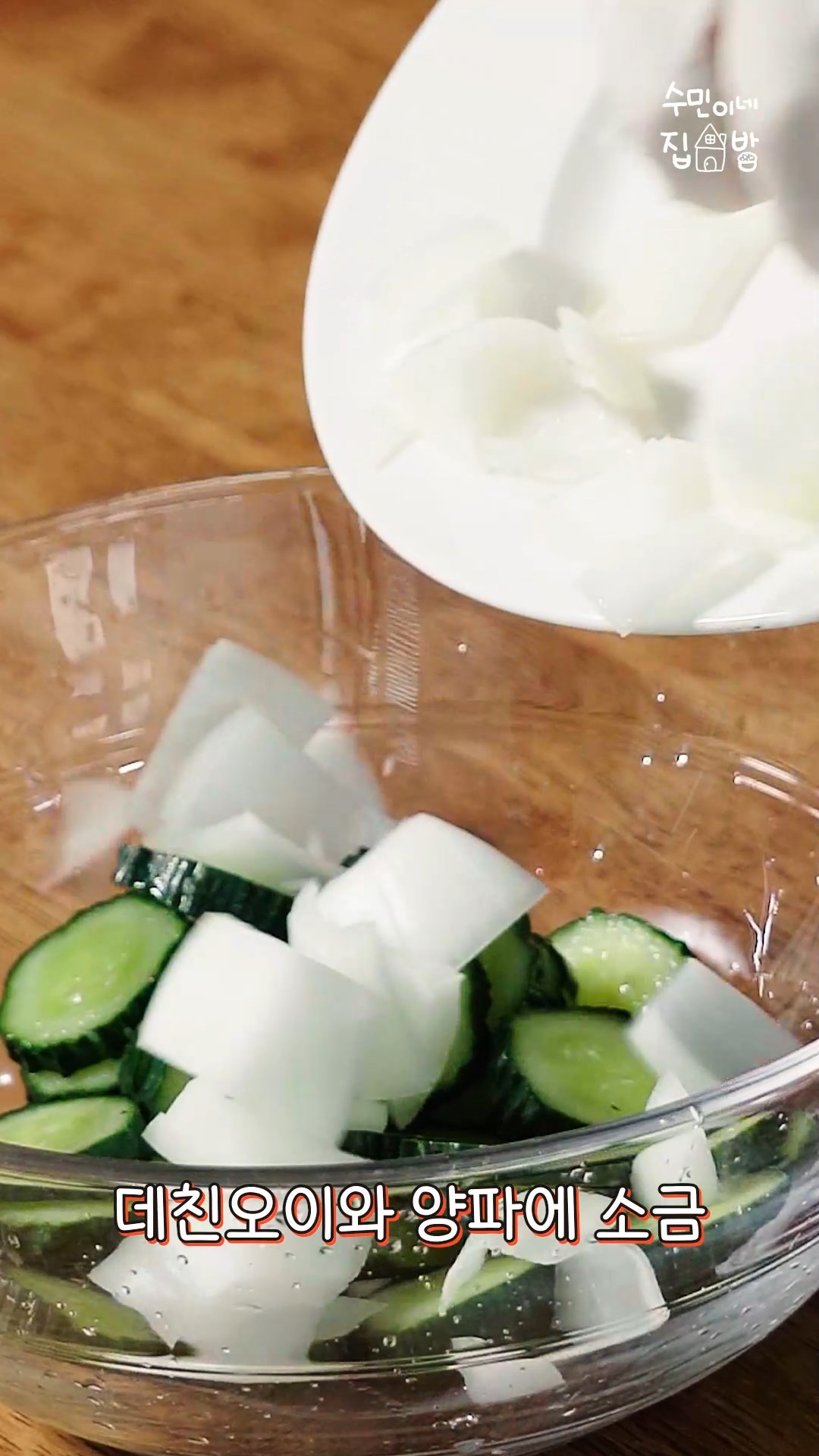 3. 데친오이, 양파에 소금,설탕을 넣고 20분 동안 절여주세요.