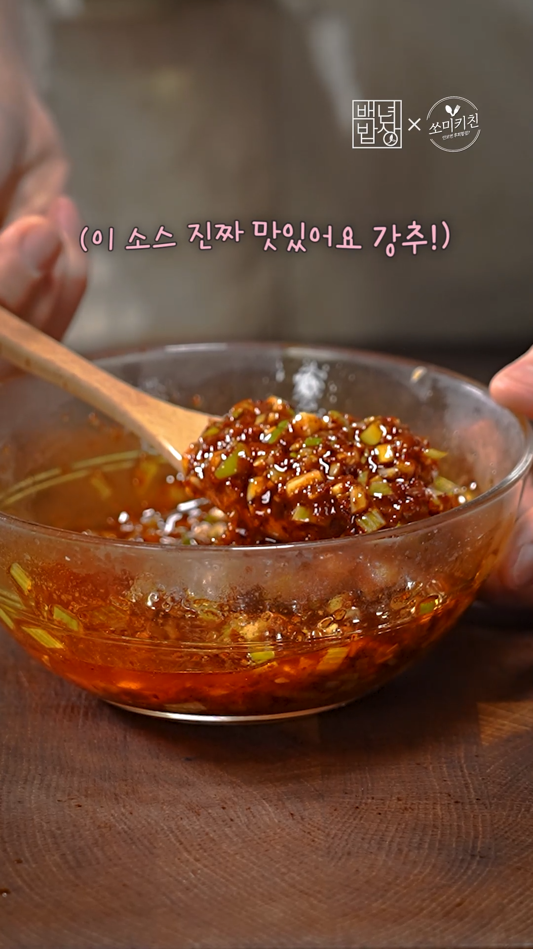 2. 그릇에 마늘과 대파, 고춧가루, 굴소스, 진간장 넣고 뜨거운 식용유 넣어 섞어주세요.