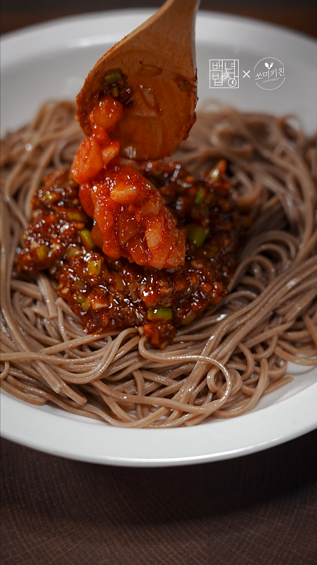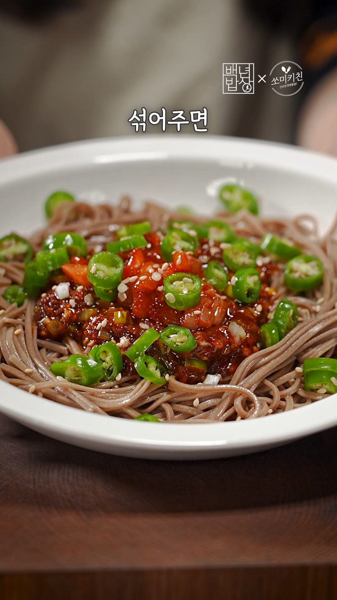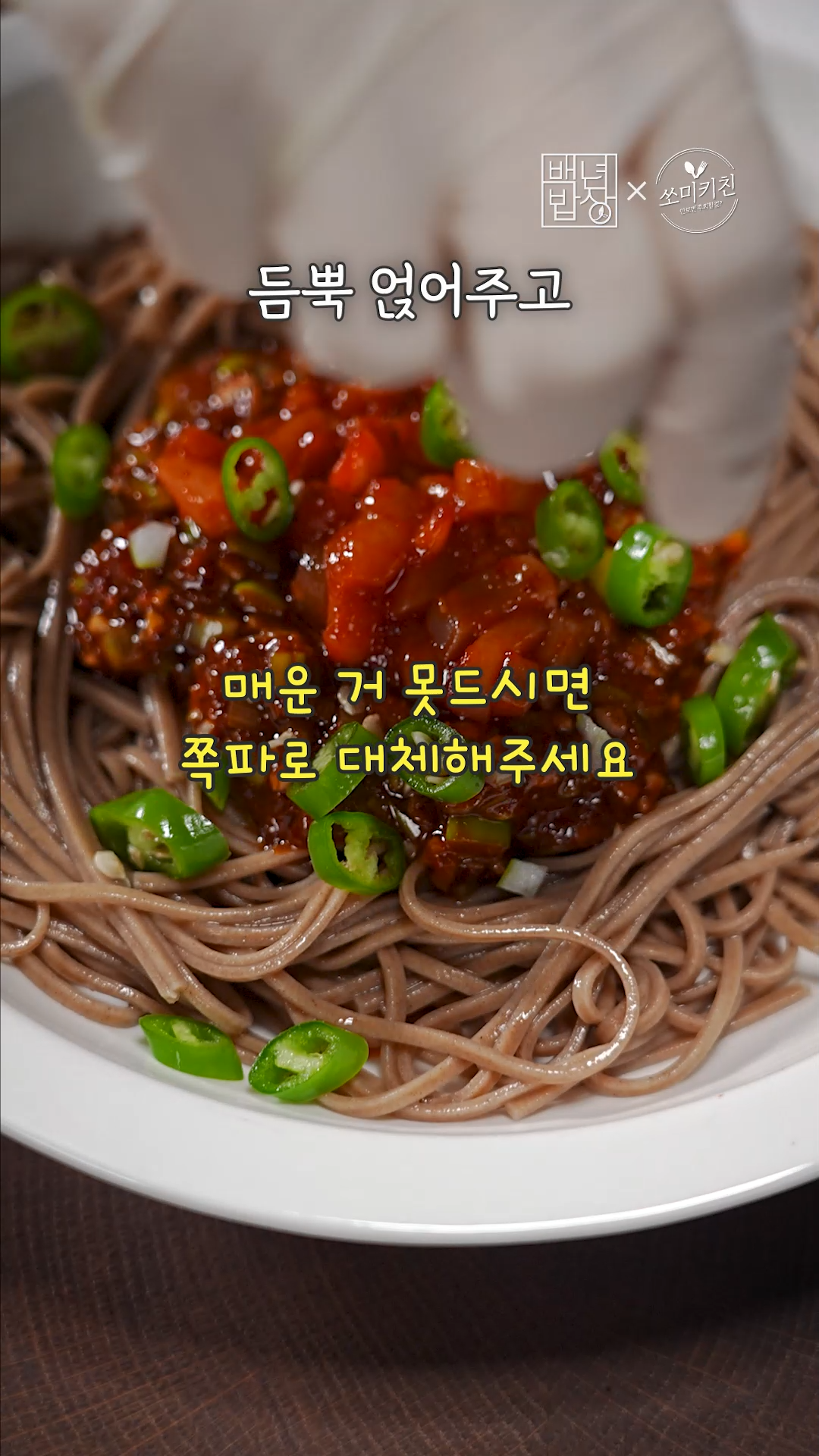 4. 메밀면 위에 소스와 오징어젓갈, 청양고추 듬뿍 얹어주고 참기름 통깨 뿌려 섞어주면 완성!