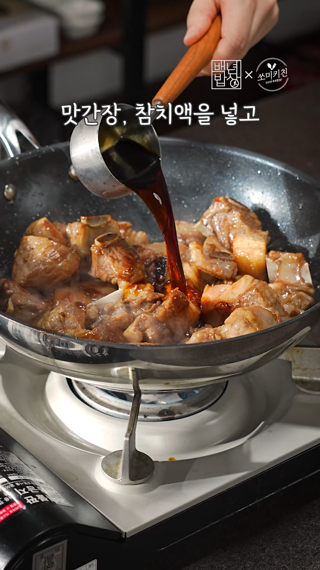 5. 설탕, 미림 넣어 골고루 입혀준 뒤, 맛간장, 참치액 넣고 볶아줄게요.
