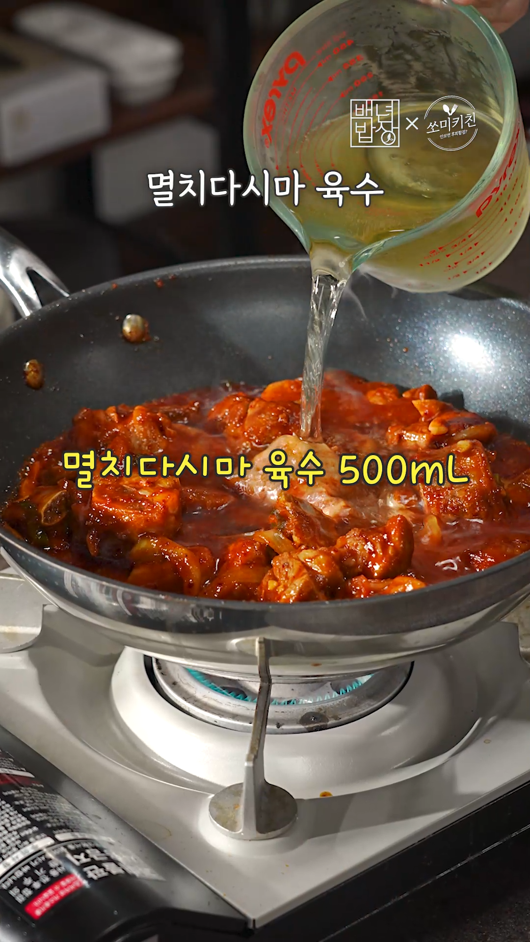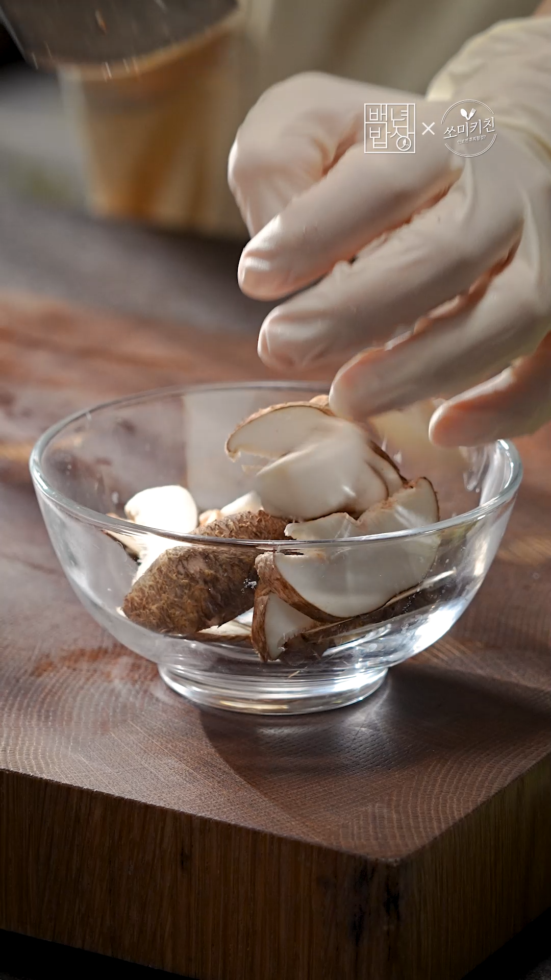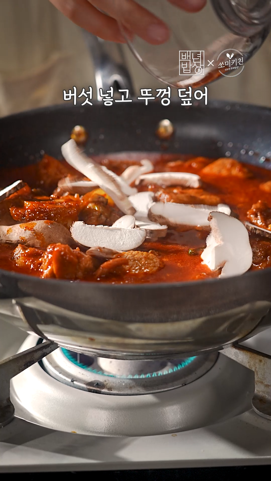 7. 육수랑 미원 넣어주고 버섯 넣고 뚜껑 덮어 30분간 졸여주세요.