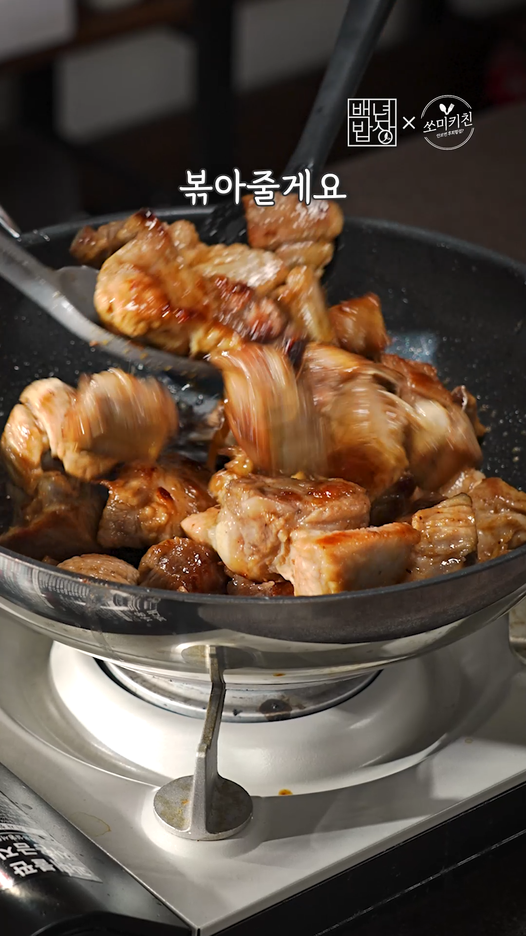 4. 팬에 돼지고기 비계 부분이 아래로 가도록 노릇하게 구워줍니다.