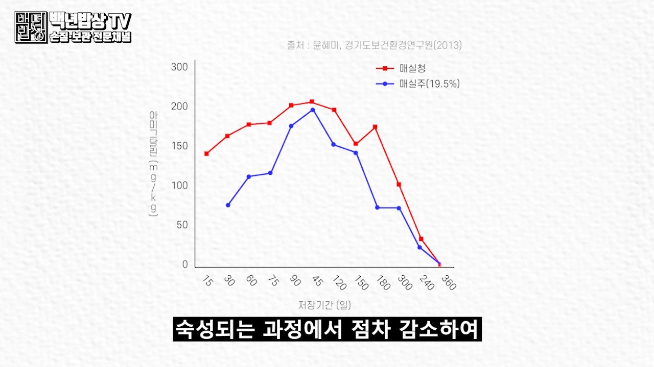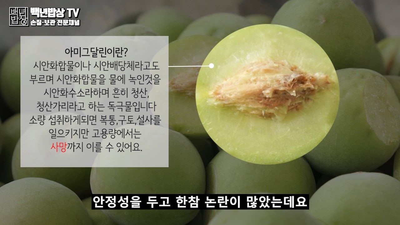 아미그달린은 매실이 숙성되는 과정에서 점차 감소하며 1년 후에는 모두 분해되며, 분해 과정에서 생성된 시안화수소(청산)도 모두 휘발되어 안심하고 먹을 수 있습니다.