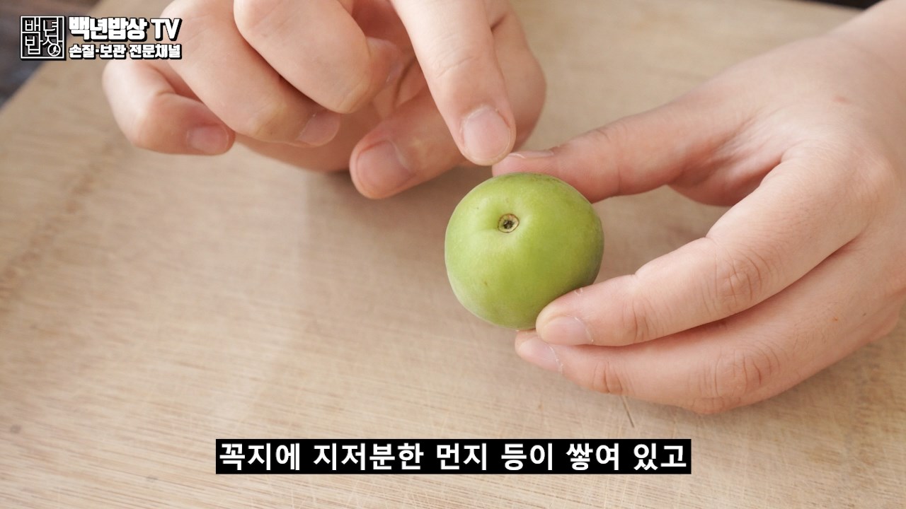꼭지에 지저분한 먼지 등이 쌓여 있고 쓴맛이 날 수 있으니 뾰족한 도구를 사용하여 꼭지를 제거해 주세요. 상처 난 매실은 칼로 제거 후 사용해 주세요.