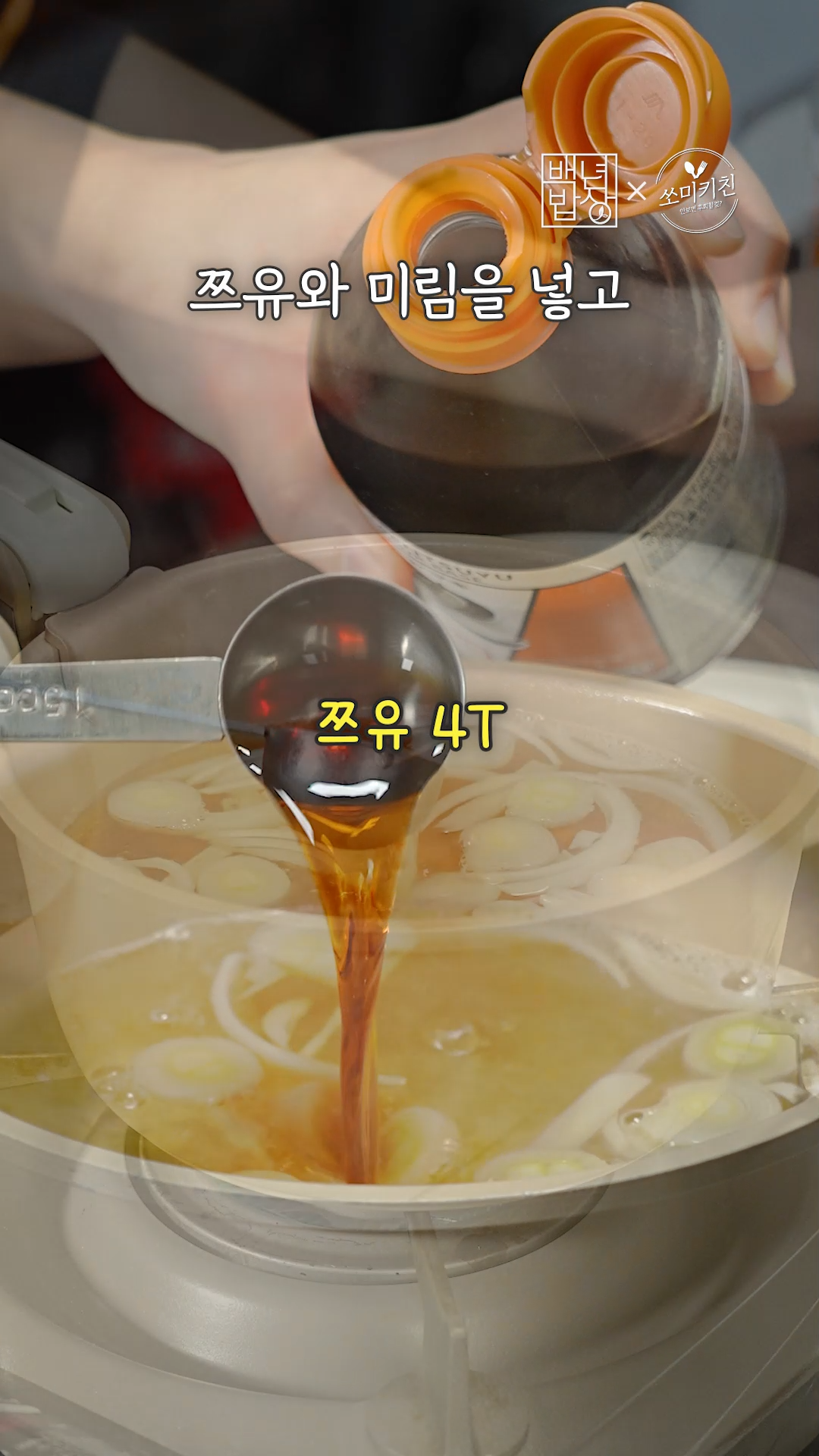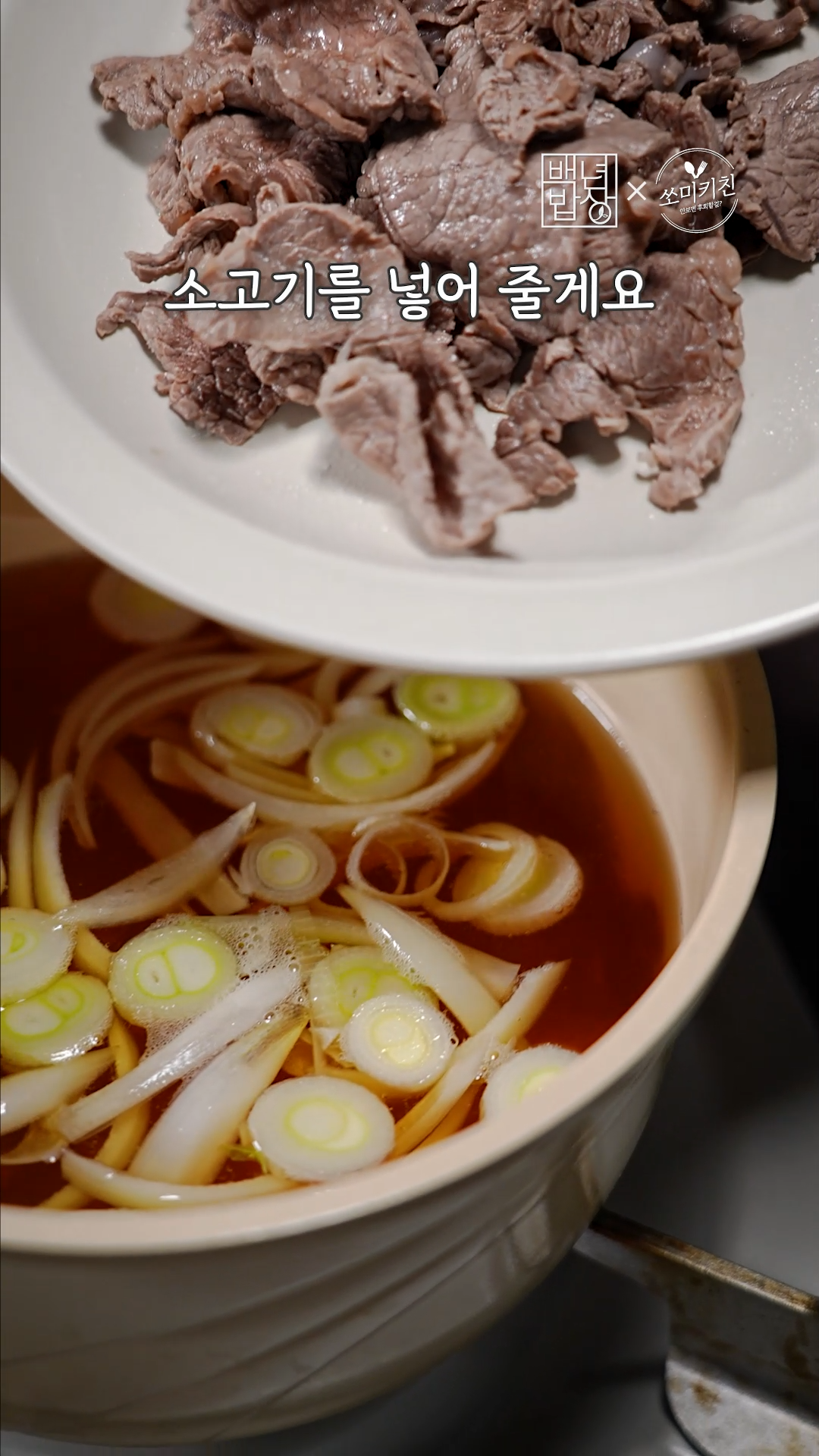 3. 멸치다시마 육수에 양파와 대파 넣어준 다음, 쯔유(진간장 대체 가능), 미림을 넣고 소고기를 넣어줍니다.