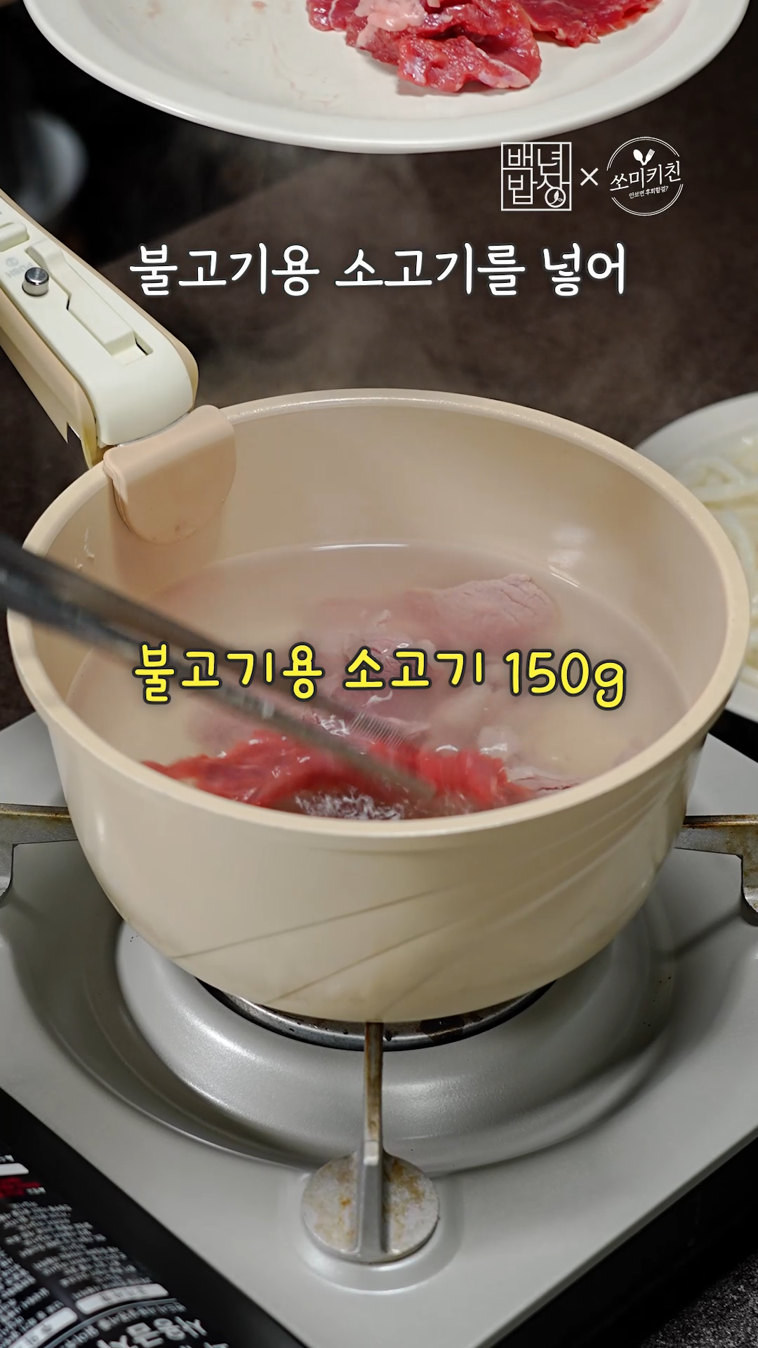 2. 다 익었으면 접시에 살짝 빼두고 우동 삶은 물에 불고기용 소고기를 넣고 살짝 데쳐주세요.