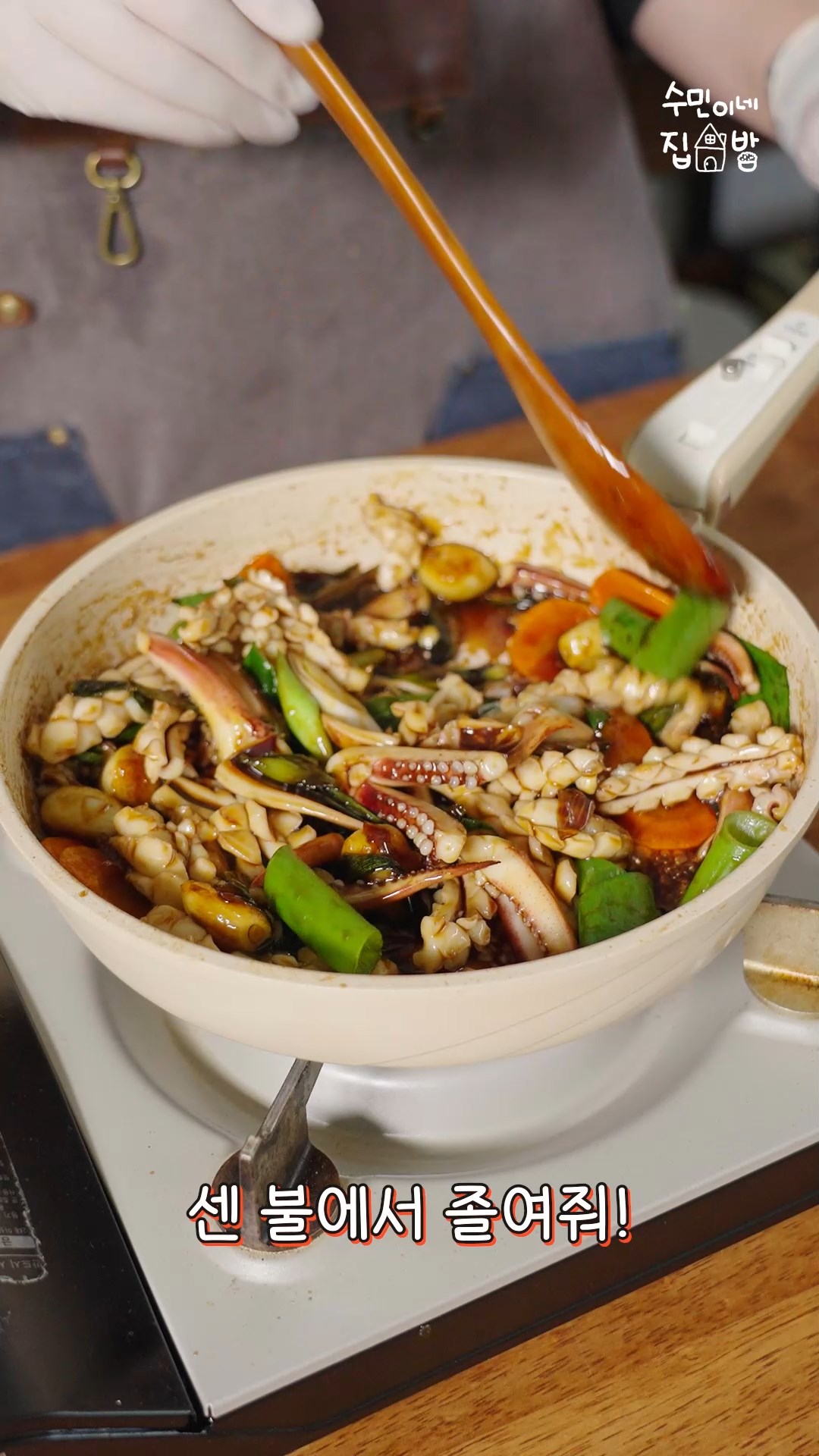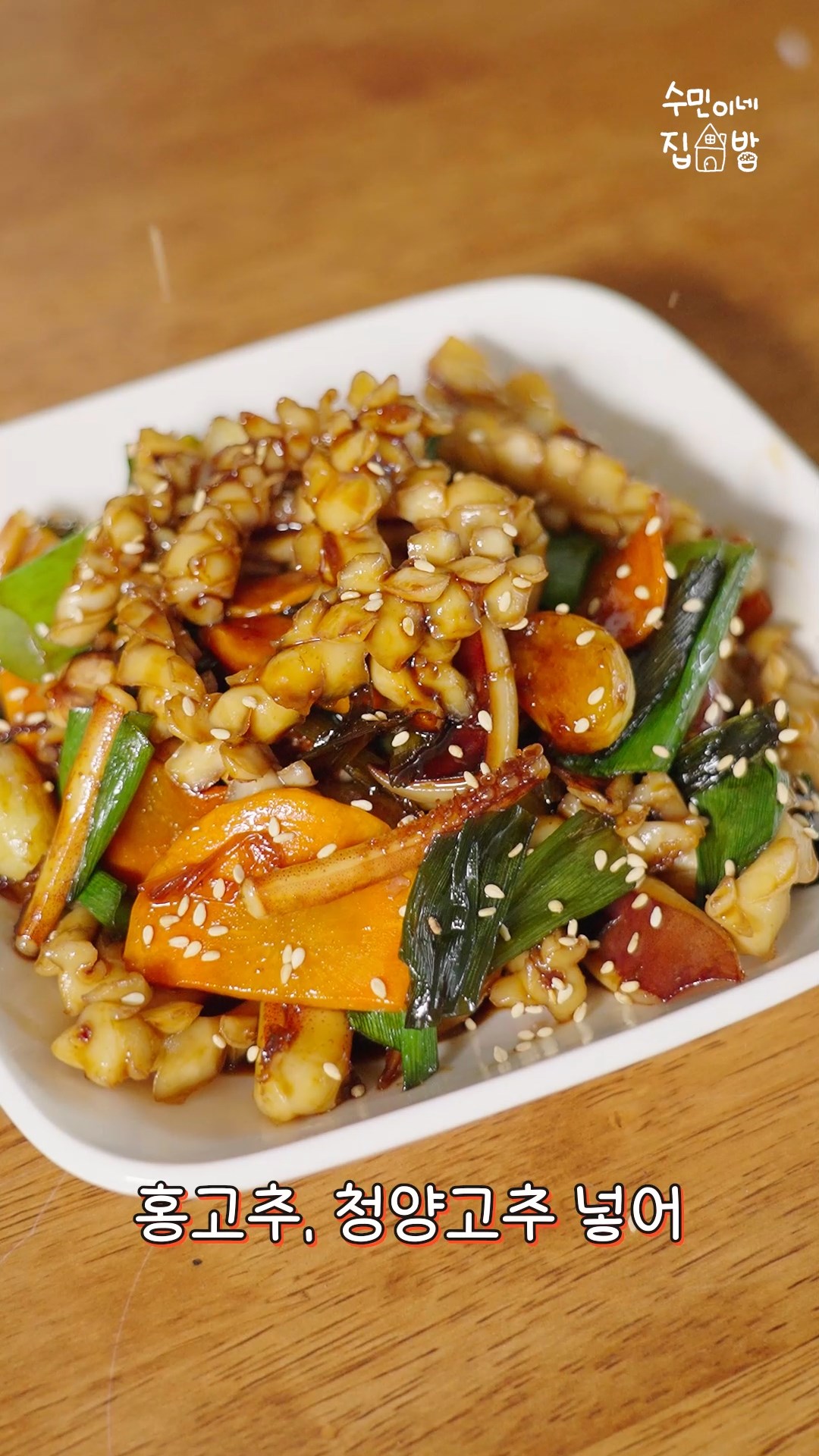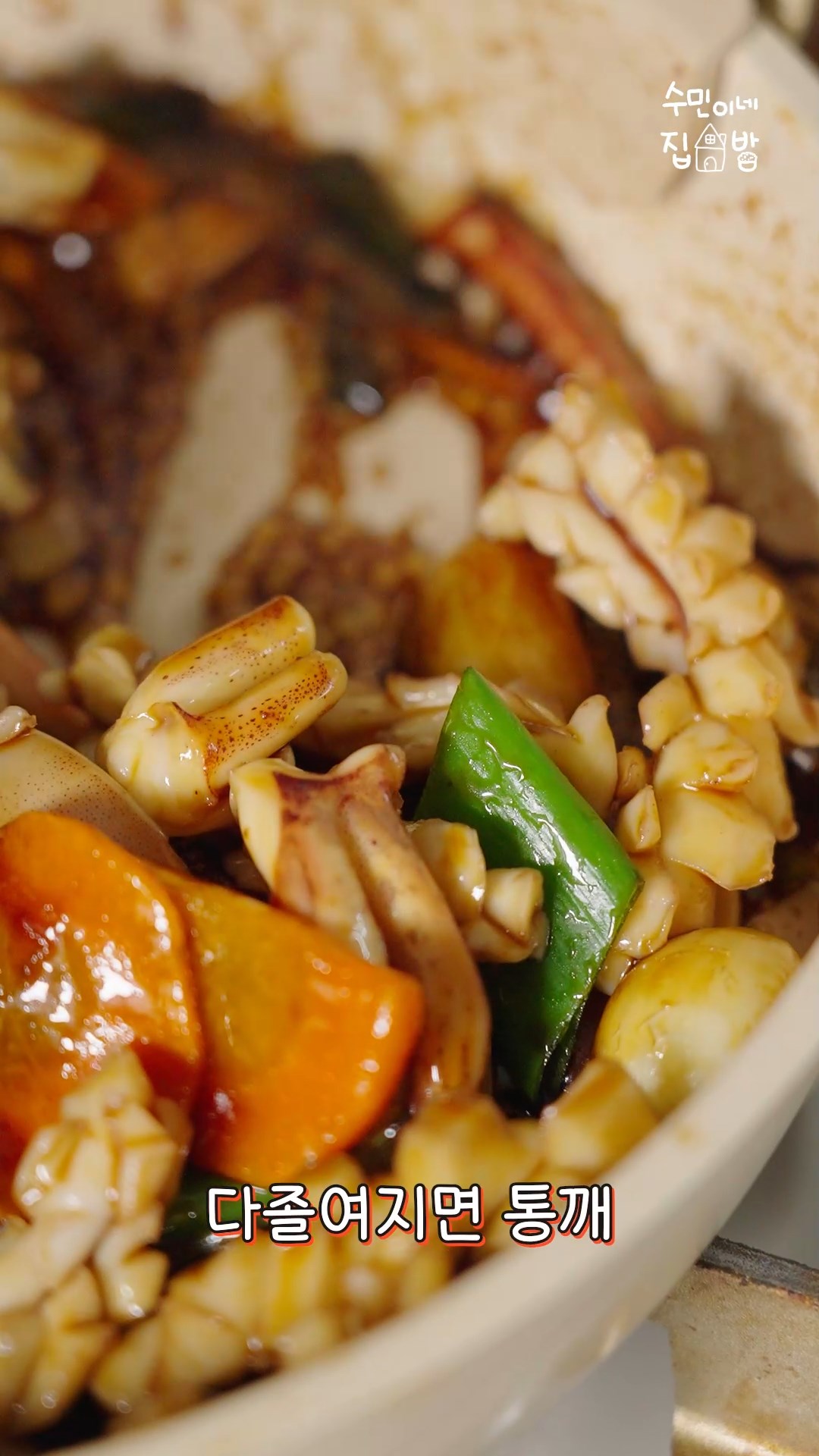 오징어 2마리청양고추 2개홍고추 1개당근 1/5개대파 2대통마늘 10개진간장 3T굴소스 1/2T맛술 2T올리고당 3T통깨후추